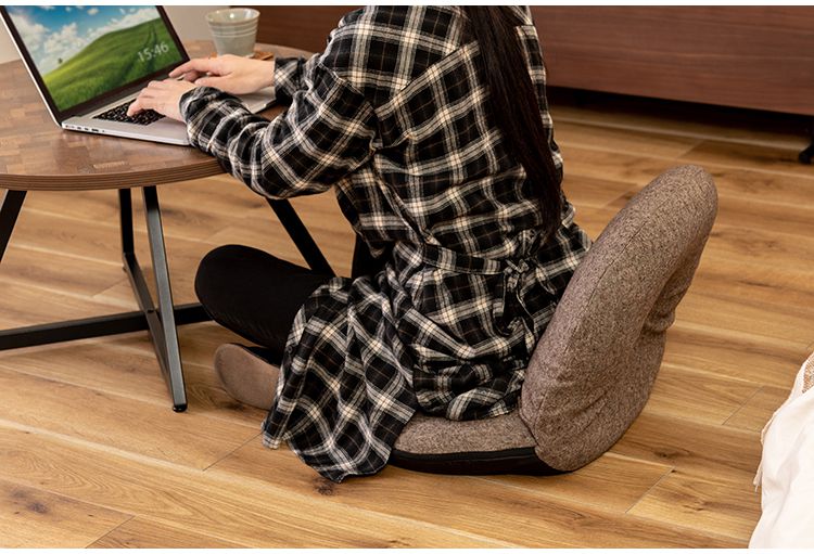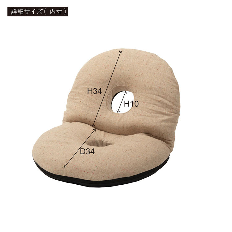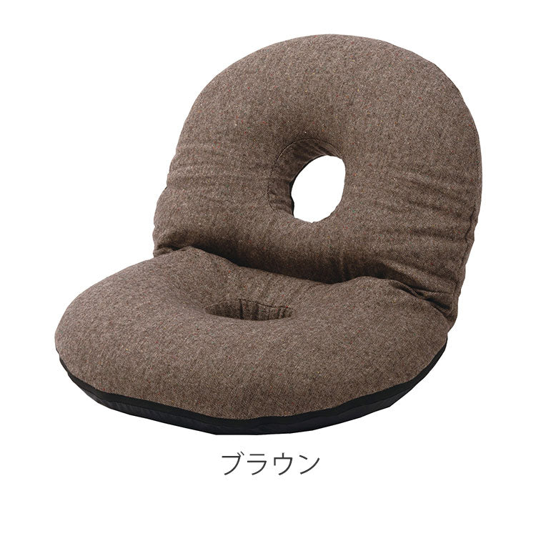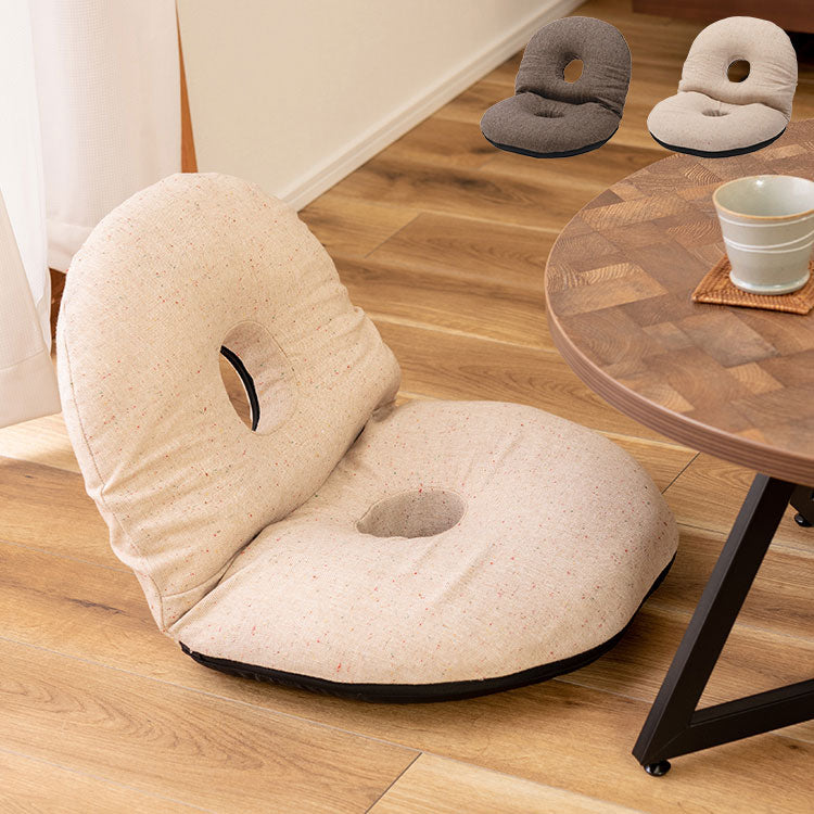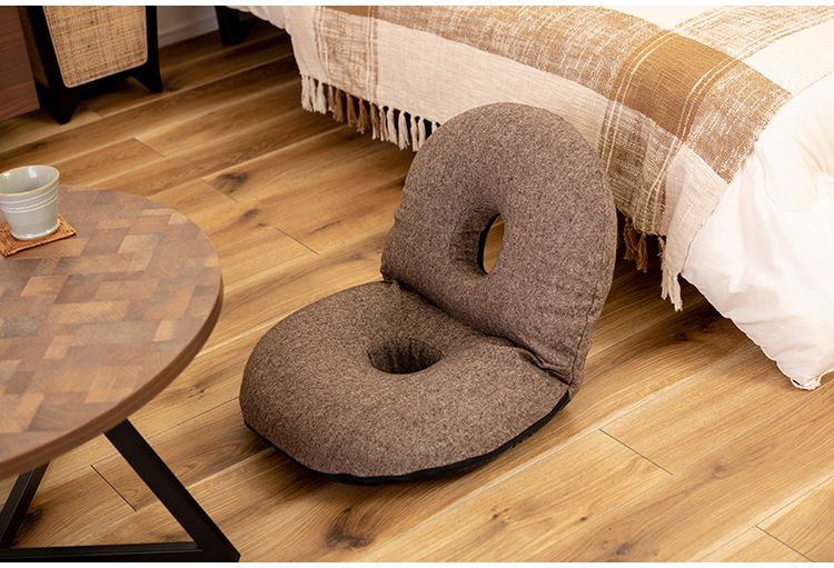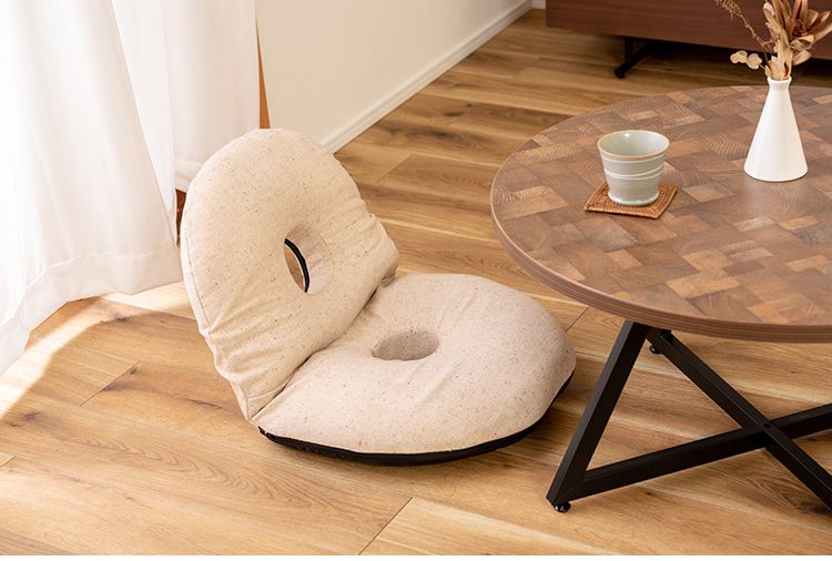 ●ふだん使いにちょうどいい、ドーナツ型のかわいいフロアチェア。●座面や背もたれは、ドーナツのように中央に穴が開いたデザイン。座った時の圧迫感を緩和し、お尻にかかる負担をやわらげてくれるので長時間の使用に適したフロアチェア。●座面には低反発ウレタンを使用しているので、しっとりと柔らかくフィットした座り心地。●また座面はほど良い高さなので、ごろ寝枕としても使えます。●簡単に折りたたむ事ができ、軽量タイプなので持ち運びラクラクで収納も場所を取りません。