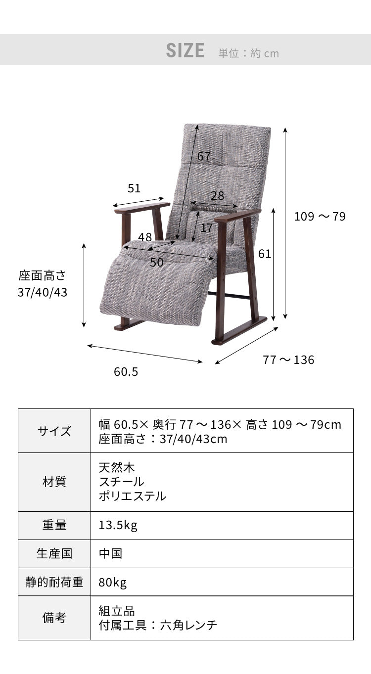 幅60.5×奥行77~136×高さ109-79(座面高さ)37/40/43(cm)