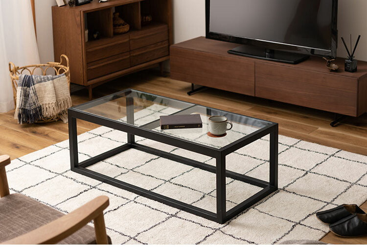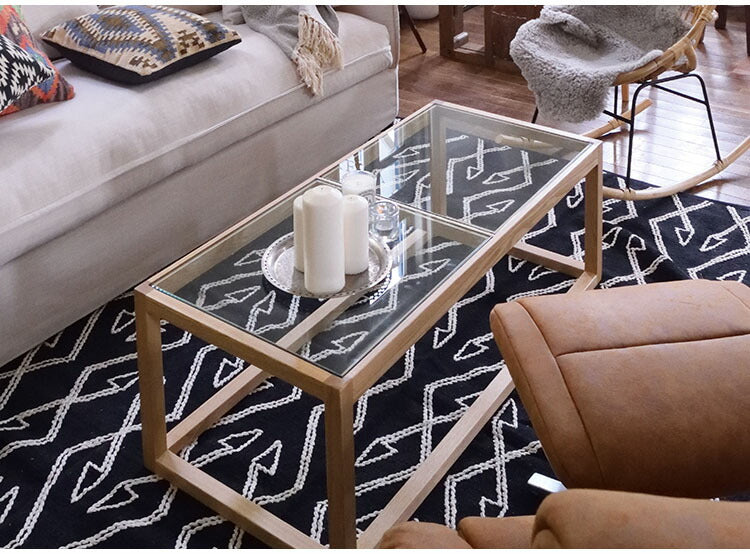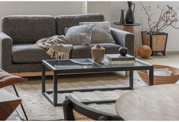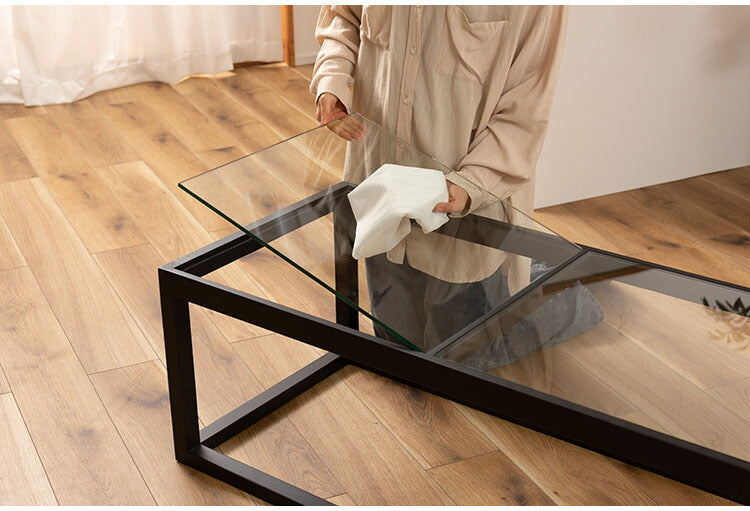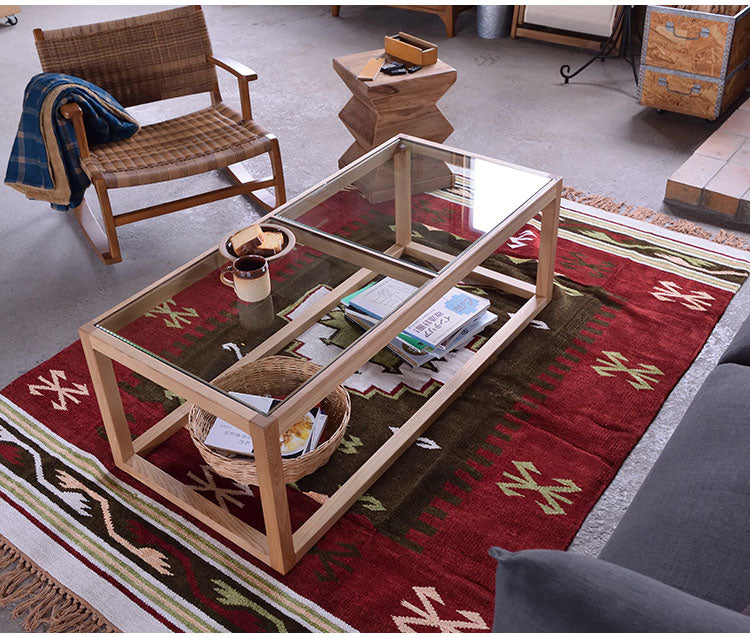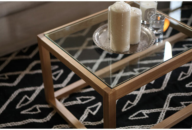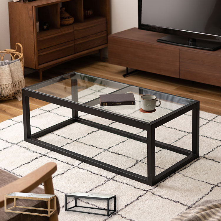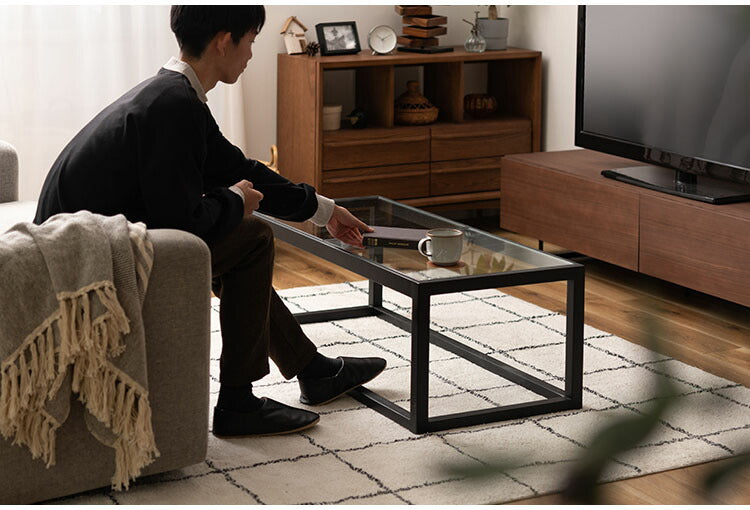 クリアガラス天板とアッシュ天然木を組み合わせたリビングテーブル。スクエアなデザインと視界を遮らないガラス天板は、圧迫感なく空間をスタイリッシュに演出します。