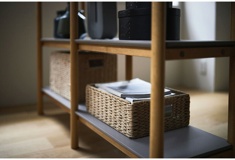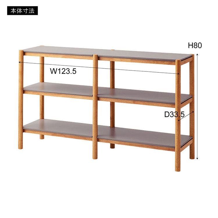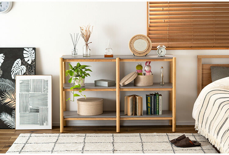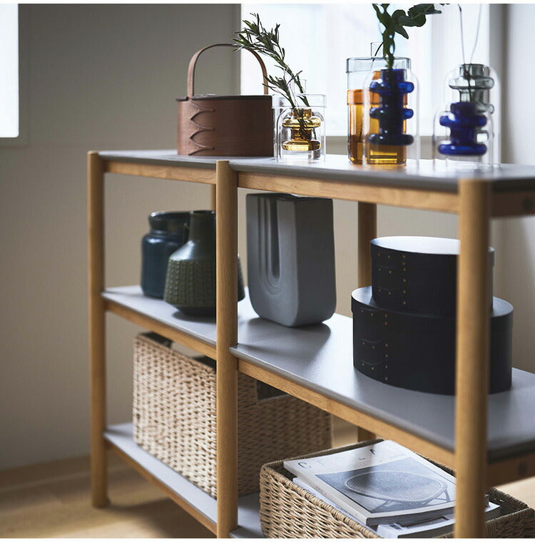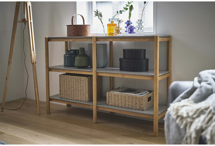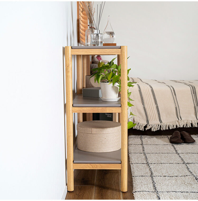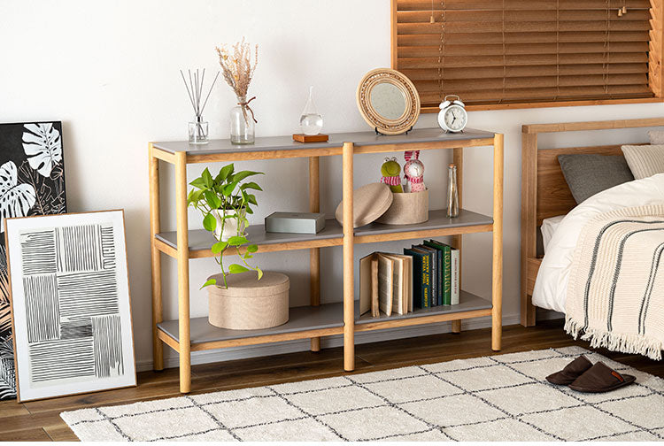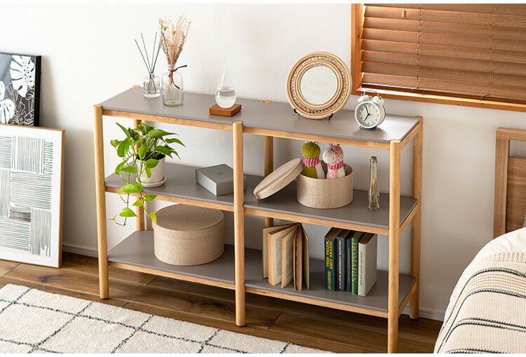 木目を活かしたナチュラルなフレーム部分と、絶妙なくすみグレーの棚板のコントラストがやさしい印象を与えてくれるシェルフです。