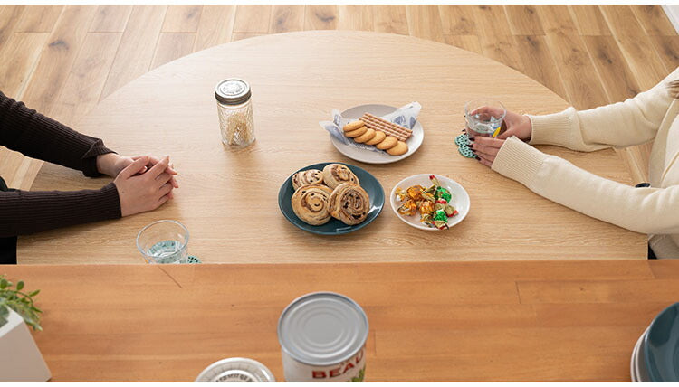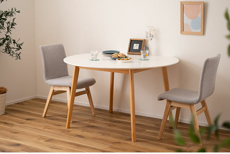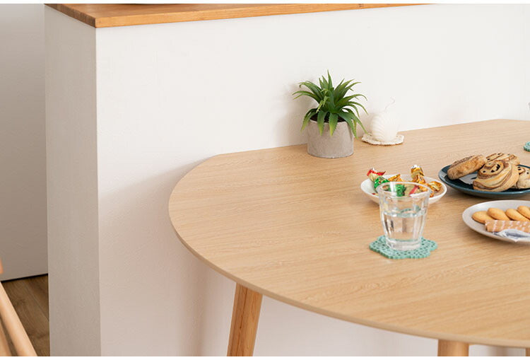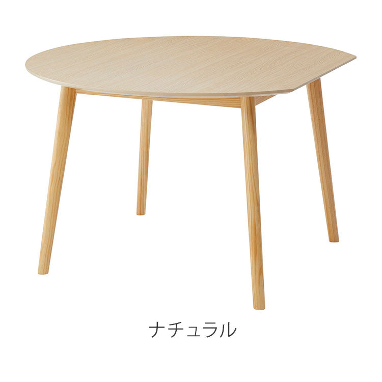 ●キッチンカウンターや壁面に合わせて使用できる変形テーブル。●省スペースでも、ラウンドタイプのテーブルとして使用できます。●4人掛けとして使用にも十分な広さのテーブルです。●天板サイドの小口はデザイン性の高い船底形状。●組立は付属の六角レンチを使い脚を取り付けるだけの簡単組立。●天板表面はNA・WHどちらも凹凸のない仕様。NAは木目調デザイン。WHは単色のきれいな仕上がり。●天板下には幕板が付いているので反り止めにもなり安定した形状。●脚裏にはフェルトが付いているので、床への傷防止にもなり安心です。