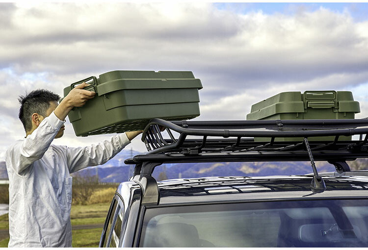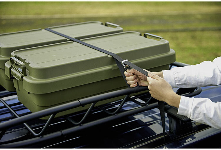 また、フタにベルトガイドの溝を付けたことにより車のルーフキャリーなどに装着し固定できるようになっております。