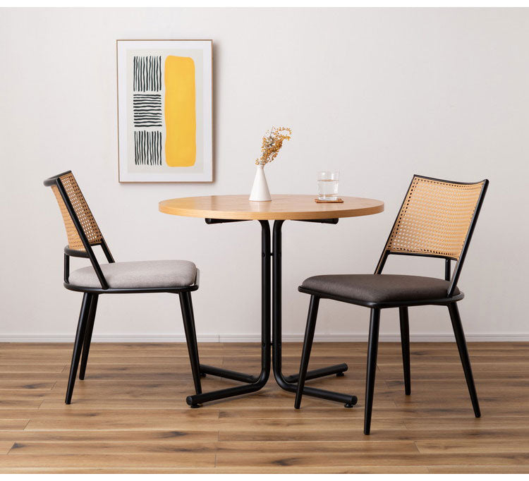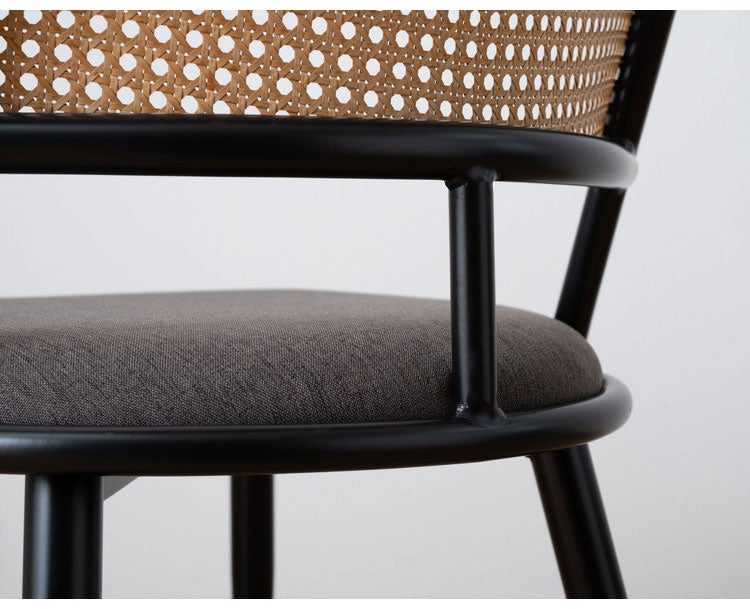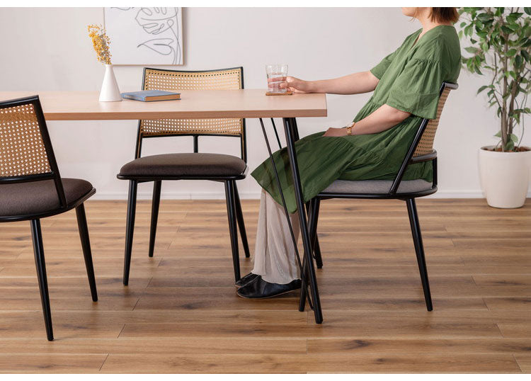 ●ポリエチレン素材のラタン調デザインを施した背面と、ファブリック素材の座面の組み合わせが新鮮なチェア。