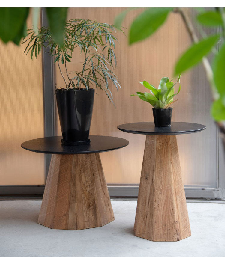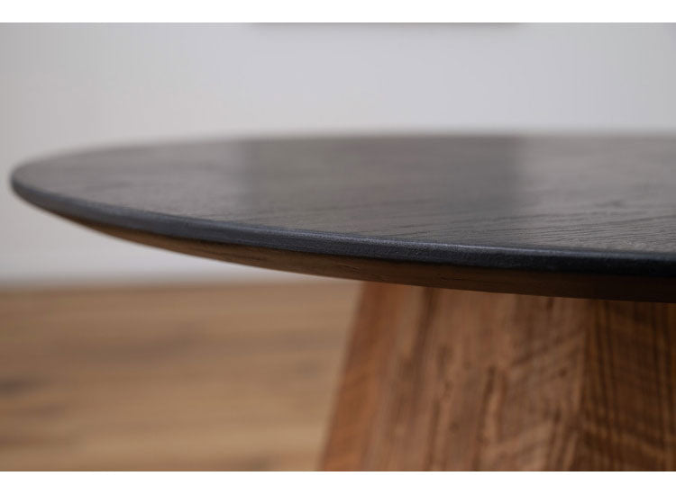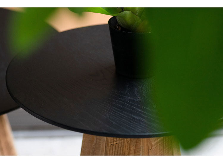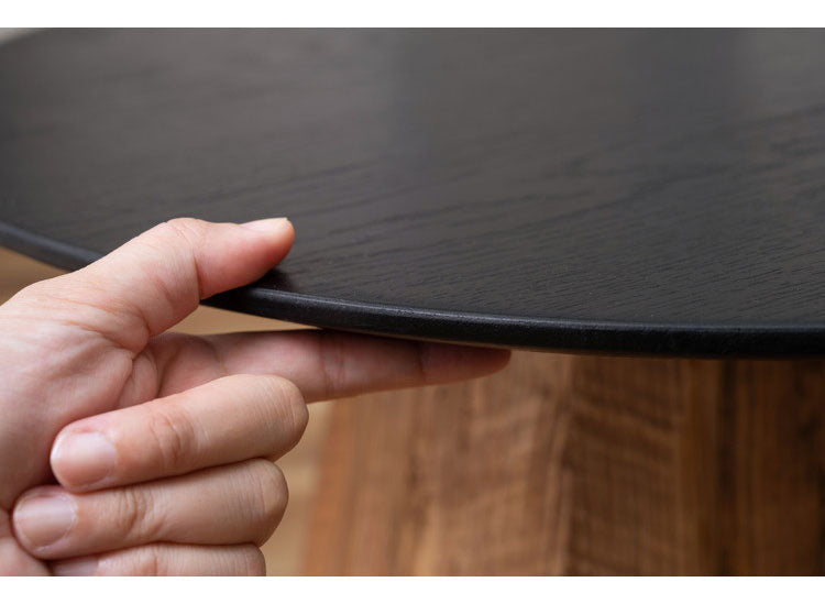 オークの美しい木目を残して塗装された黒い天板とひとつひとつ表情の違うパイン古材の脚が上品さを出しつつ、ぬくもりを感じさせるデザインのテーブル。ナチュラルやモダンなど、様々なテイストに馴染みます。