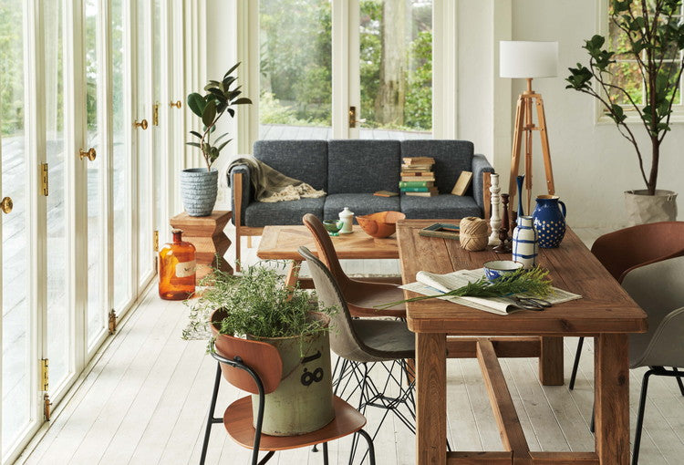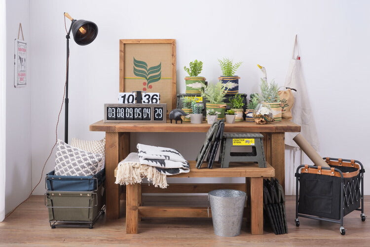 重厚感・重量感のある風合いが魅力的なテーブルとベンチ。