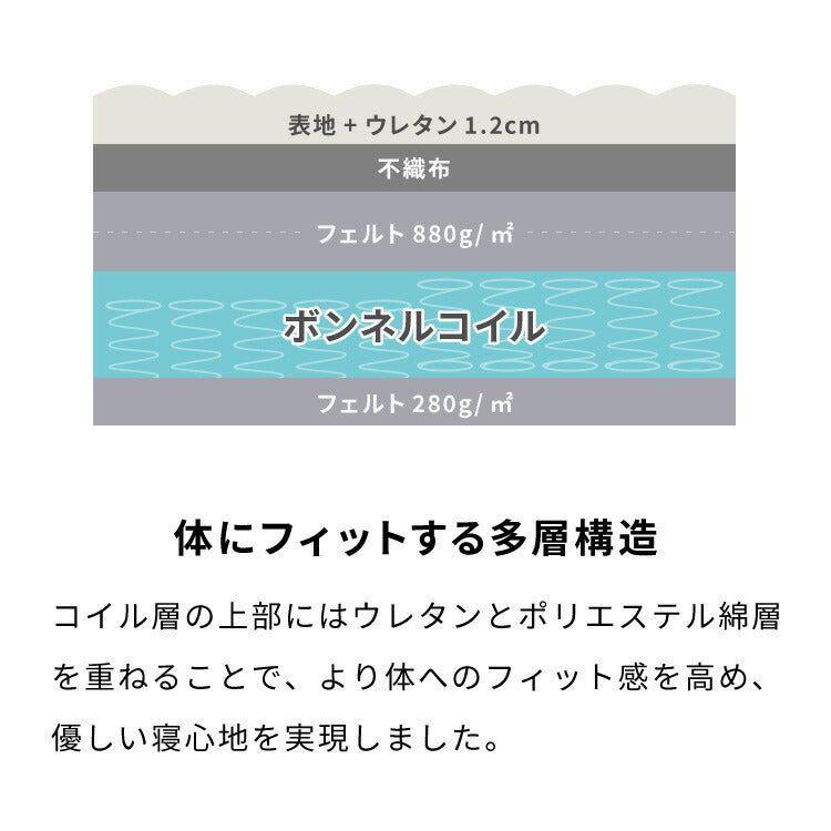 更にコイル層の上部にはウレタンとポリエステル綿層を重ねることで、より体へのフィット感を高め、やさしい寝心地にを実現しました。