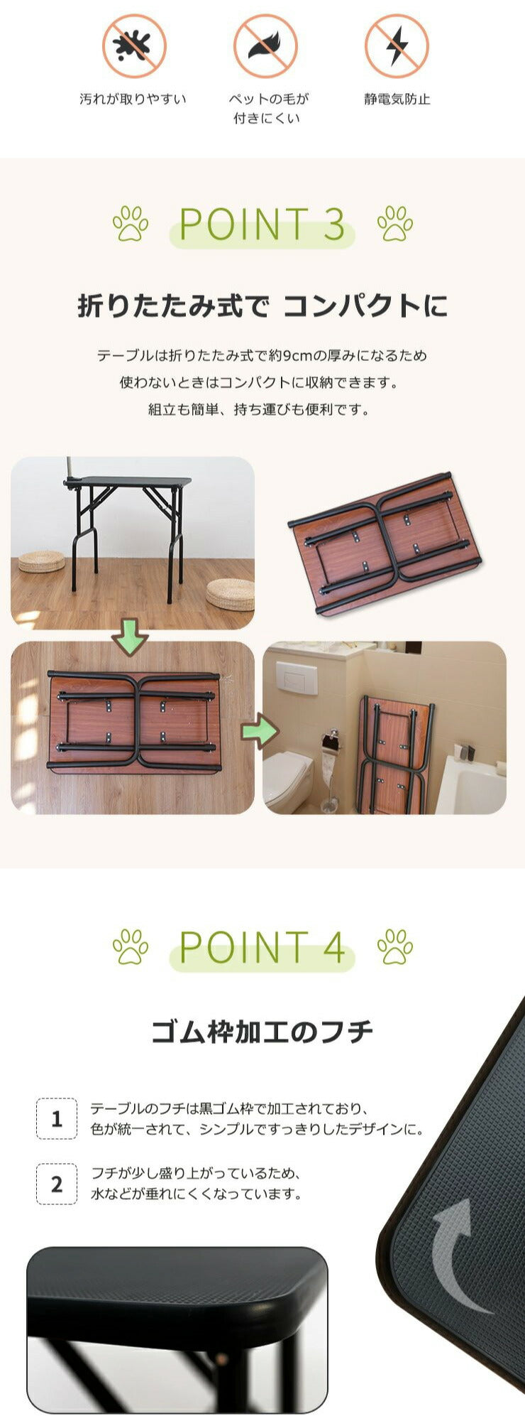 折りたたみ、トリミングテーブル、幅81cm、奥行48cm、高さ75cm、網棚付き、収納付き、滑り止め付き、コンパクト、省スペース、アーム高さ無段階調節、ドライヤークリップ、ドライヤーホルダー、ドライヤースタンド、ハンズフリー、ドライヤー、トリミング、爪切り、小型犬、中型犬、猫