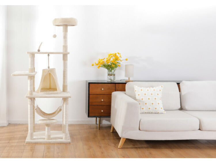 キャットタワー、キャットハウス、キャットツリー、猫タワー、据え置き、ハウス、ハンモック、猫、ねこ、ネコ、爪とぎ、つめとぎ、ベッド、おもちゃ、多頭飼い、シンプル、かわいい、インテリア、ペット、ペット用品、猫用品、省スペース、置き型、低ホルムアルデヒド、エコテックス、FSC認証、頑丈、安定