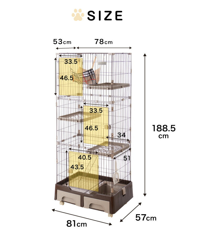 キャットケージ、3段、3段、ペット用品、ペットグッズ、キャット、猫ケージ、ケージ、ゲージ、トイレ、収納、お掃除簡単、お手入れ簡単、はしご、梯子、ドアロック、ハンモック、キャスター付き、組立、グレー、ブラウンネコ、猫用、大型、ハウス、多頭飼い、脱走防止、留守番、便利、安心、安全