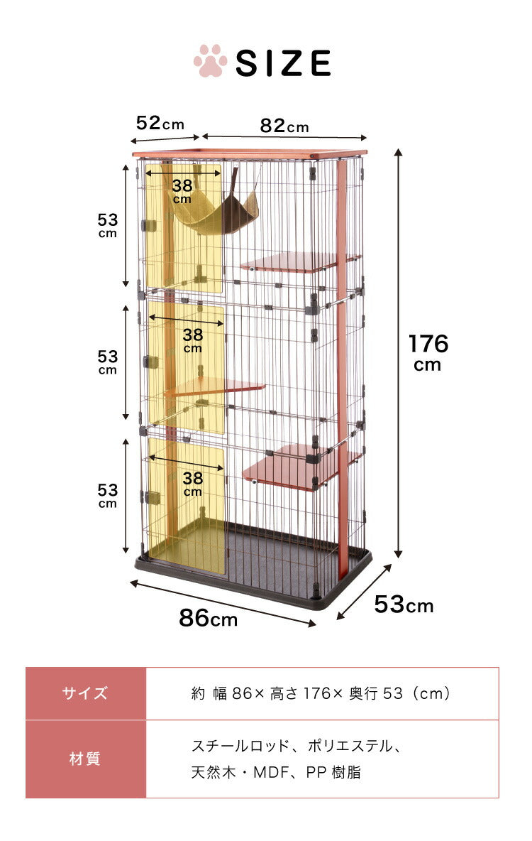 猫 ケージ キャットケージ 3段 木製 木目調 大型 組立簡単 猫用品 ペット用品 インテリア ナチュラル サークル 猫ケージ キャットハウス ペット ハウス ハンモック ねこ 脱走防止 多頭飼い