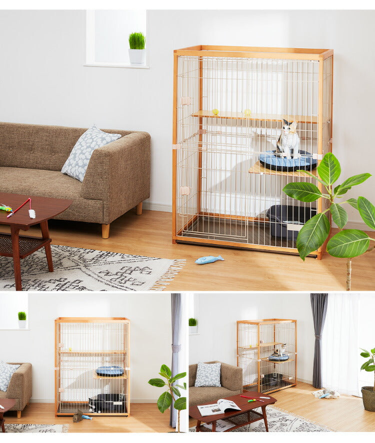 猫 ケージ キャットケージ 2段 木製 おしゃれ 木目調 インテリア スリム コンパクト 北欧 広々 大型 猫ゲージ 高級感 キャットハウス ネコ ハウス 多段 留守番 保護 脱走防止 多頭飼い 多頭 スチール