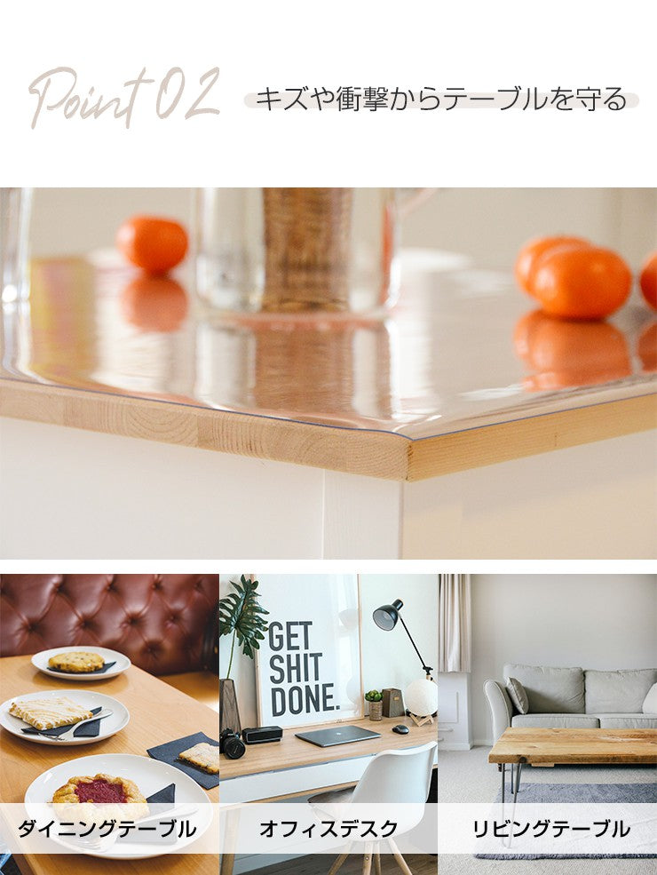 ・天板が透けるクリア素材で、インテリアのイメージを損なわず様々な場面でキズや汚れからテーブルを守ります