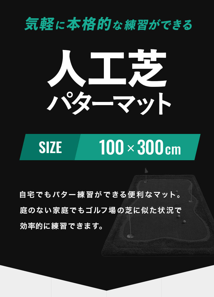 ゴルフマット、100cm×300cm、人工芝マット、グリーンマット、パター練習マット、パターマット、勾配調整、傾き調整、金属製ホールカップ、フラッグ付、本格的、ゴルフ場、自宅用、家庭用、屋内、屋外、庭、室内、練習、人工芝、グリーン、バンカー