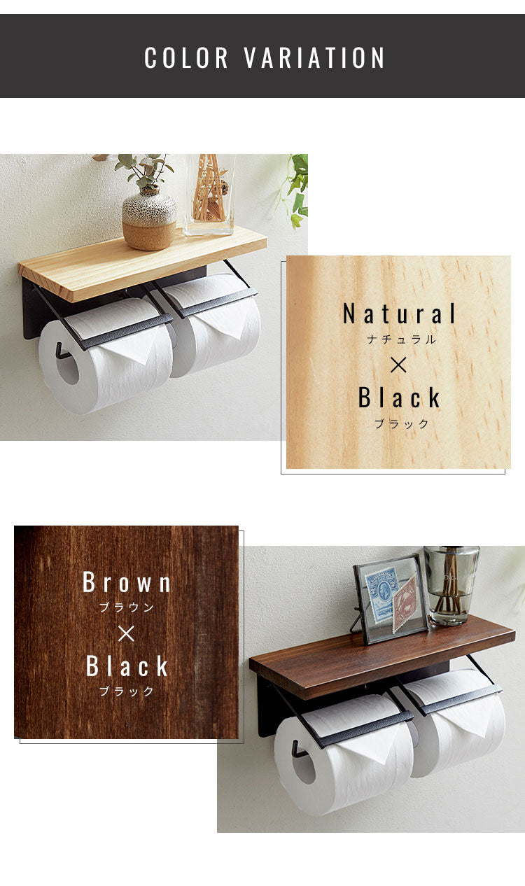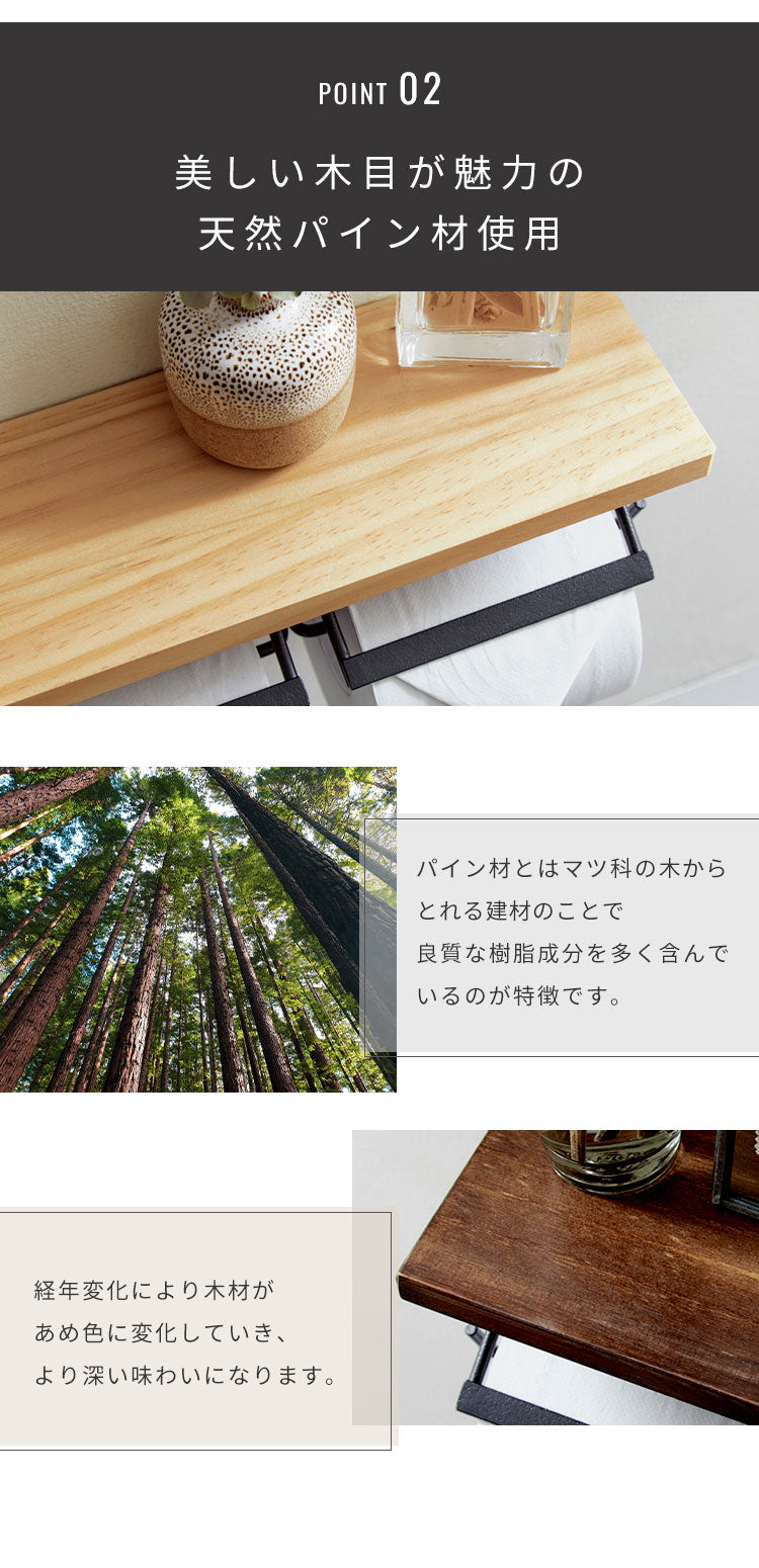 トイレットペーパーホルダー ダブルタイプ 2連 天板付き 天然木 パイン材 耐荷重5kg 棚付き アイアン 木目 飾り棚 おしゃれ モダン 北欧 アンティーク トイレ用品 トイレ 収納 お手洗い トイレットペーパー