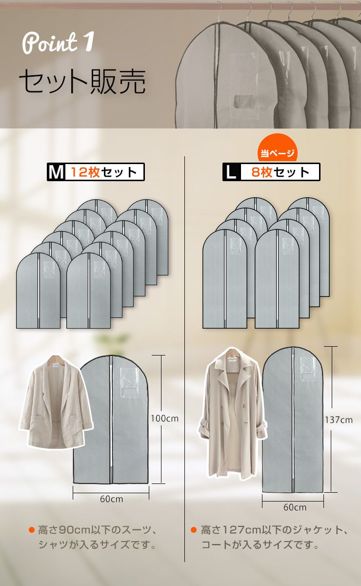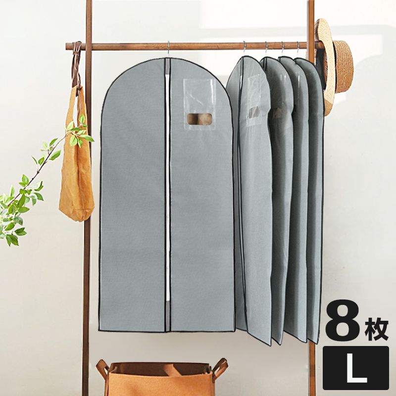 洋服カバー 8枚組 137cm 不織布 通気性 防塵 ほこり防止 日焼け防止 センターファスナー 透明窓 ポケット付き 収納 衣服収納 衣装カバー 衣服カバー 衣類カバー カバー 押し入れ クローゼット ワードローブ 引越 衣替え