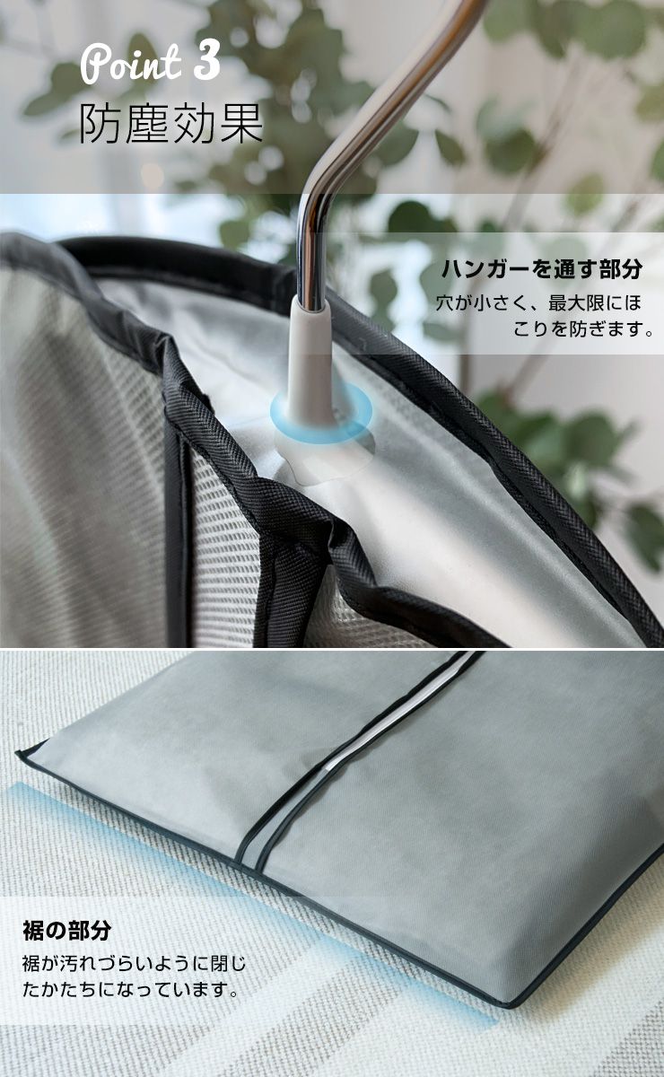 ・ハンガー穴や裾の構造にこだわり、なるべく衣類が外に晒されない事で埃から守ります