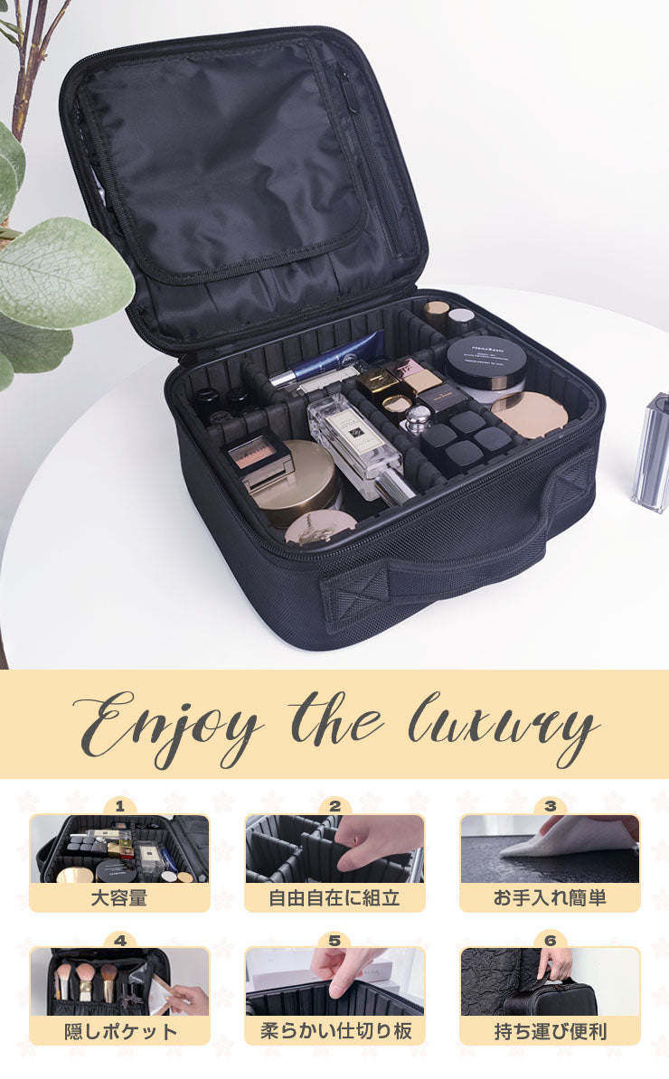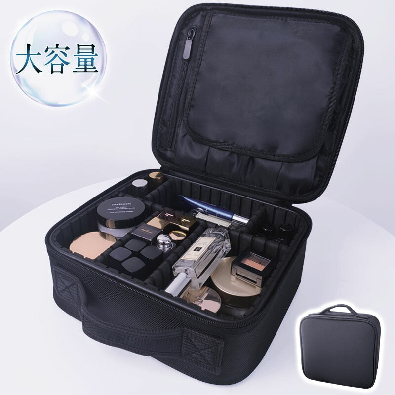 メイクボックス、大容量、ナイロン、お手入れ簡単、仕切り、ブラシポケット、持ち運び、ブラック、洗面所、寝室、ドレッサー、旅行、シンプル、化粧品ボックス、化粧ポーチ、小物入れ、メイク道具、コスメケース、コスメボックス、収納、