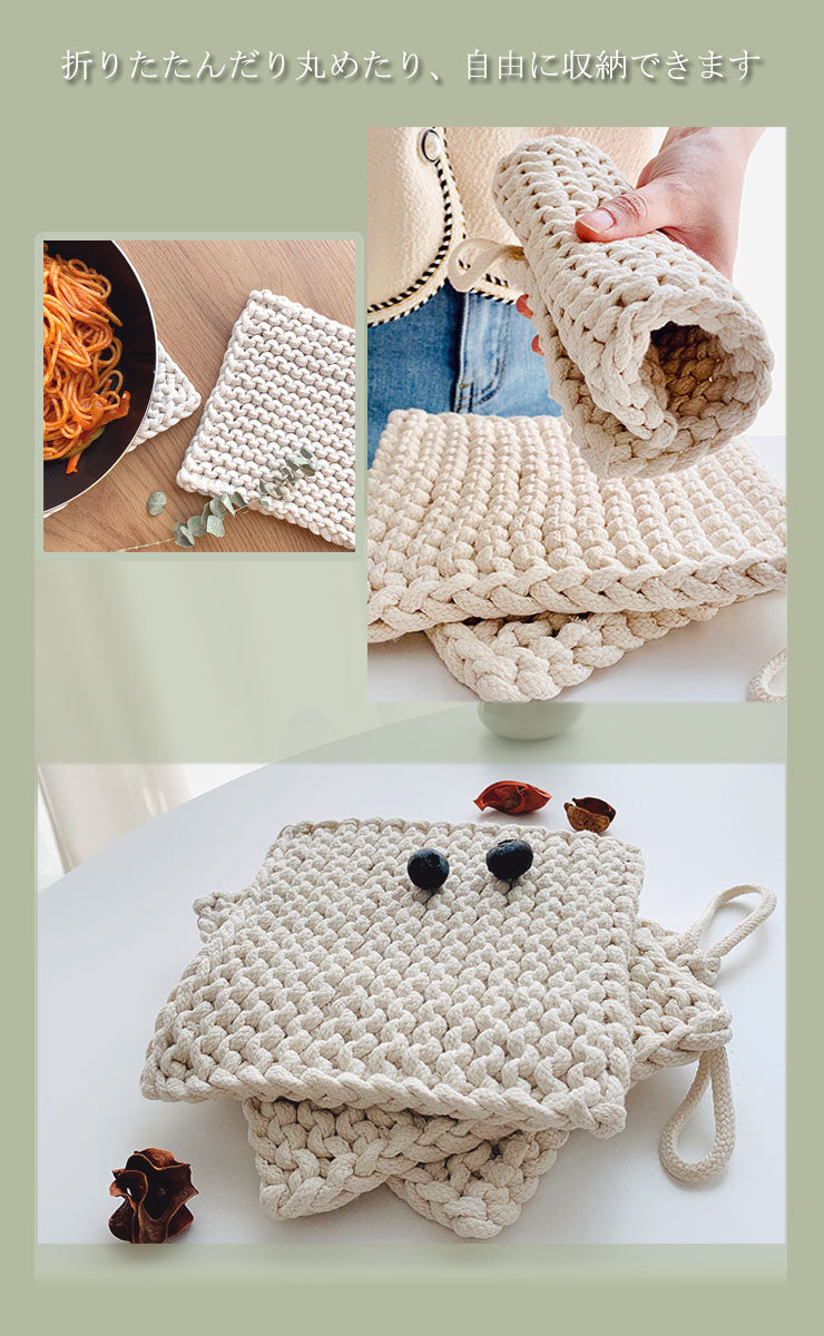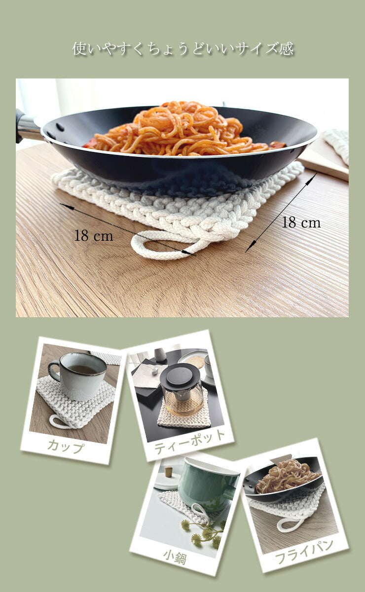 天然綿100% 綿製 鍋敷き 2枚組 鍋しき 18×18cm おしゃれ 北欧 釜敷き 綿100% コットン100% ハンドメイド 手編み コースター 手作り つり輪付き お手入れ簡単 洗える ポットマット ポイント消化(代引不可)【メール便配送】