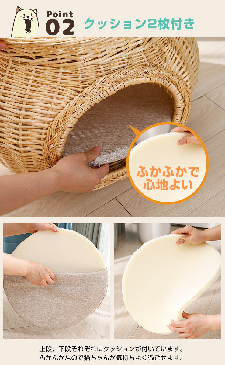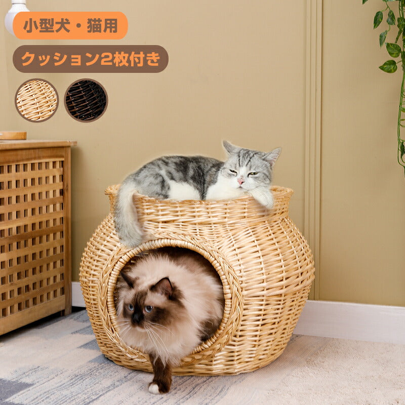 猫 ベッド ラタン風 2段ベッド クッション2枚付き 通気性 オールシーズン おしゃれ インテリア ちぐら ドーム キャットハウス 猫ベッド ペット用ベッド 小型犬ベッド ウレタンクッション付き