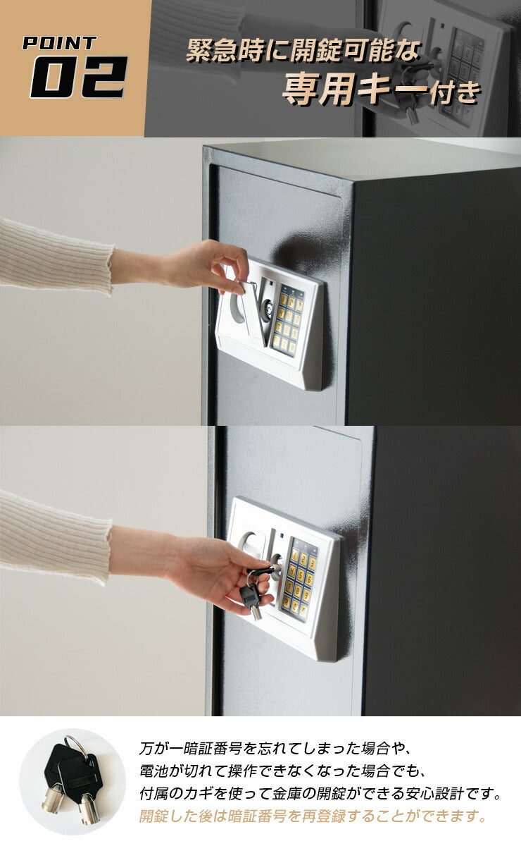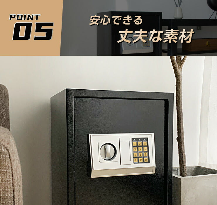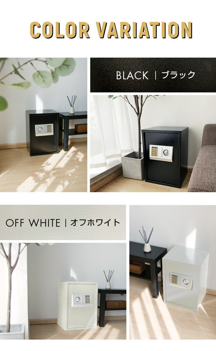 金庫、セキュリティボックス、セキュリティー対策、電子ロック、デジタル金庫、コンパクト、暗証番号、3~8桁、アンカーボルト付き、鍵付き、オフホワイト、ブラック、おしゃれ、シンプル