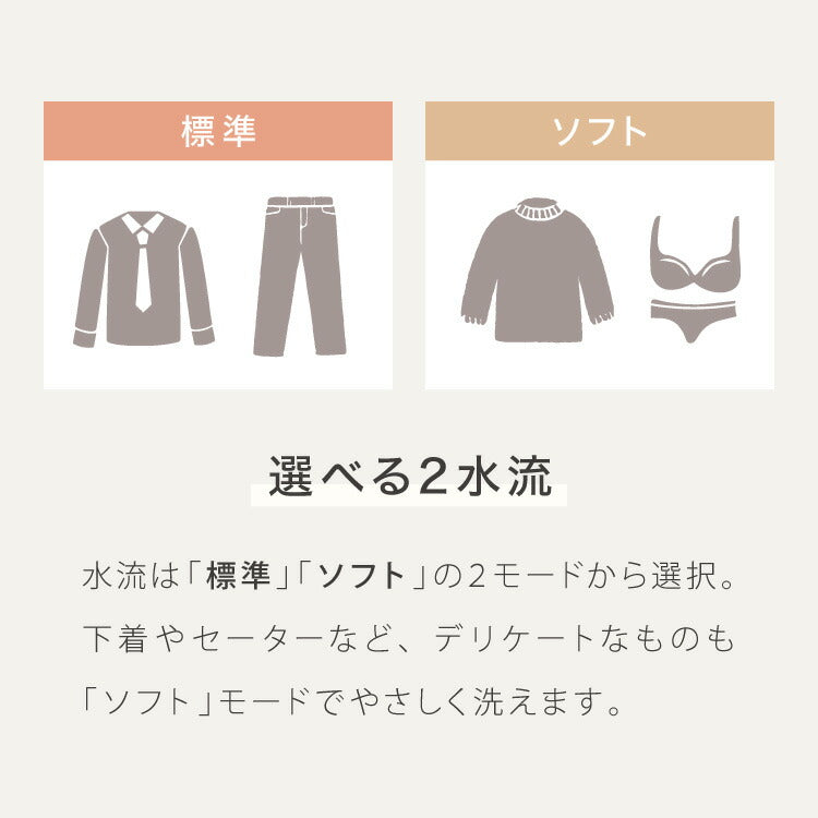 使いやすさを重視したシンプルな操作パネルを採用し、モード切替や時間設定が直感的にできます。「やさしい洗い」と「標準洗い」の2モード切替が可能で、衣類の素材や汚れに応じた最適な洗い方を選べます。