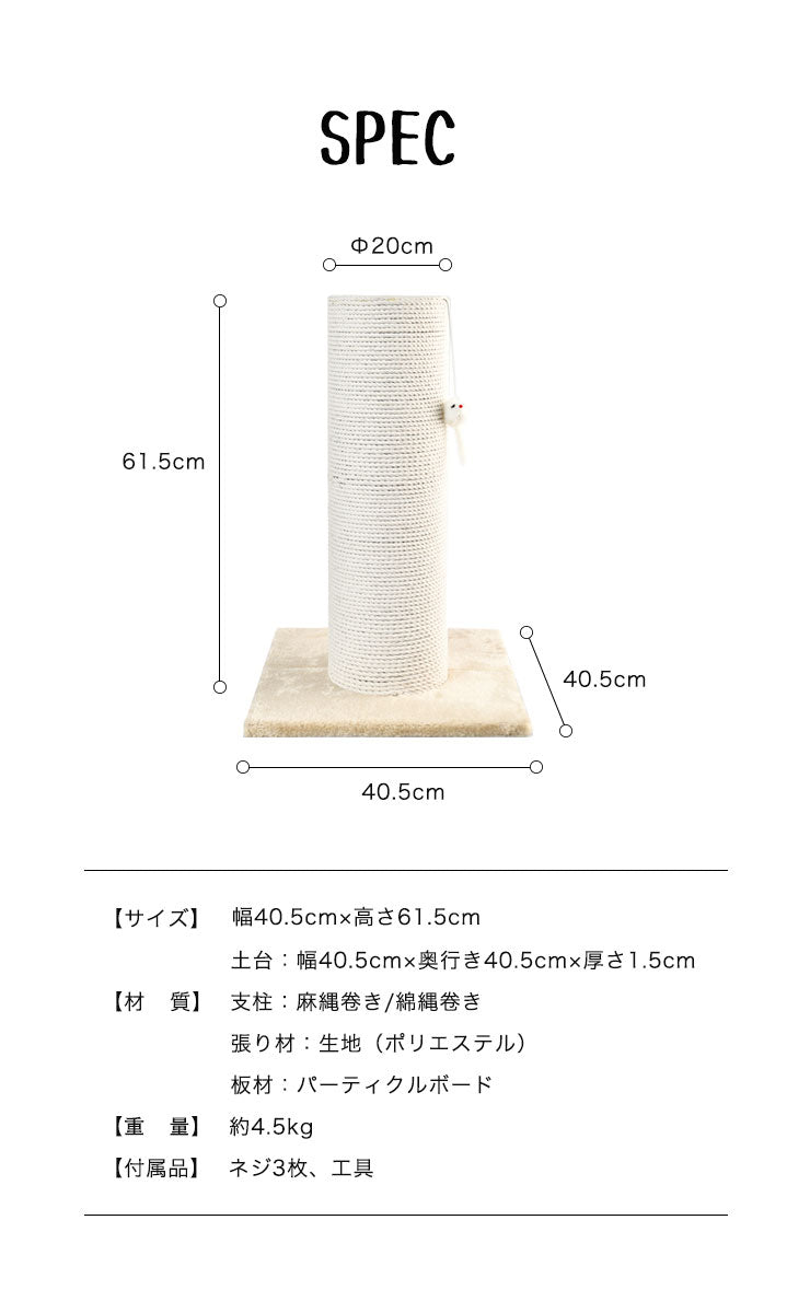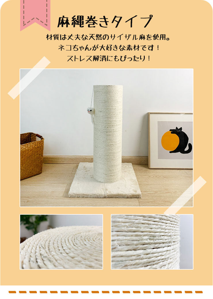 爪とぎ 猫 キャットタワー 極太 木製 ポール 直径20cm 組立簡単 麻 綿 据え置き 高さ61.5cm 爪研ぎ 天然サイザル麻 ストレス解消