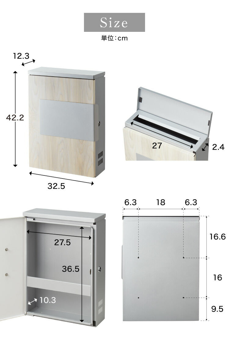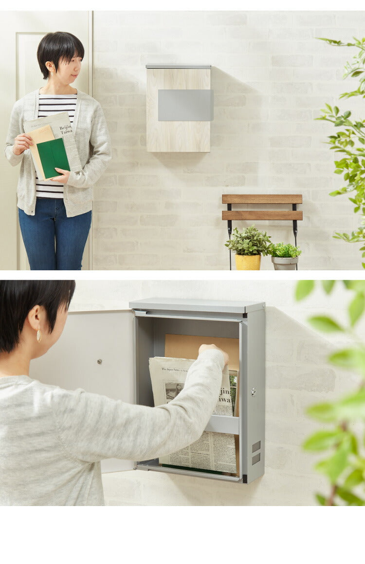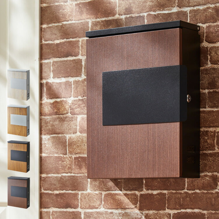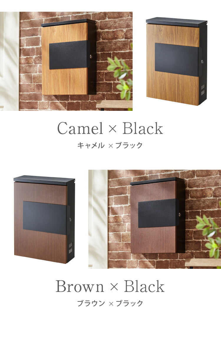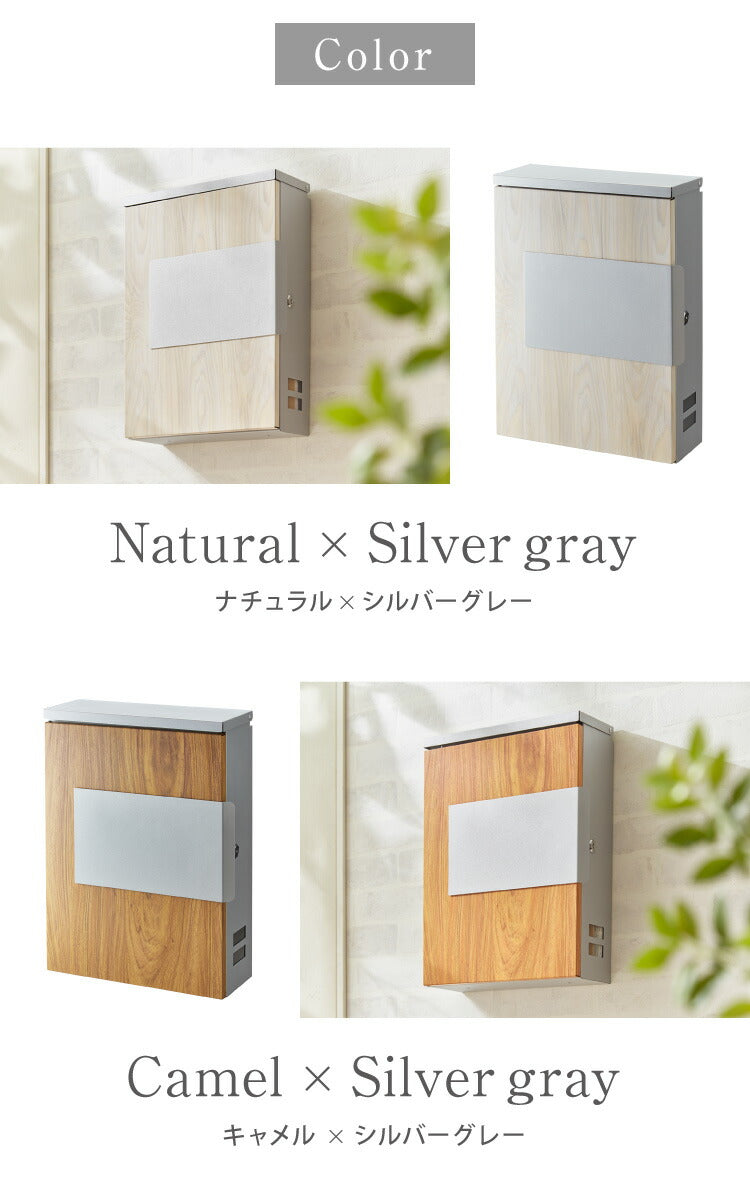 郵便ポスト、キーロック付、スチール製、角2対応、A4対応、大容量、省スペース、コンパクト、軽量、サビにくい、おしゃれ、木目調、鍵付き、セキュリティ、壁付けポスト、郵便受け、郵便、ポスト、メールボックス、POST、ナチュラル×シルバーグレー、ブラウン×ブラック、キャメル×ブラック、キャメル×シルバーグレー