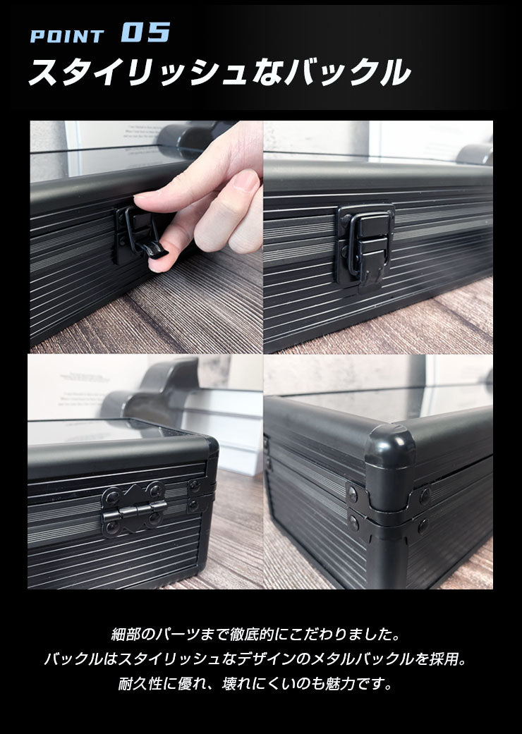 丈夫で軽いアルミに透明な窓で、コレクションケースといてのインテリア性も高くなっています。