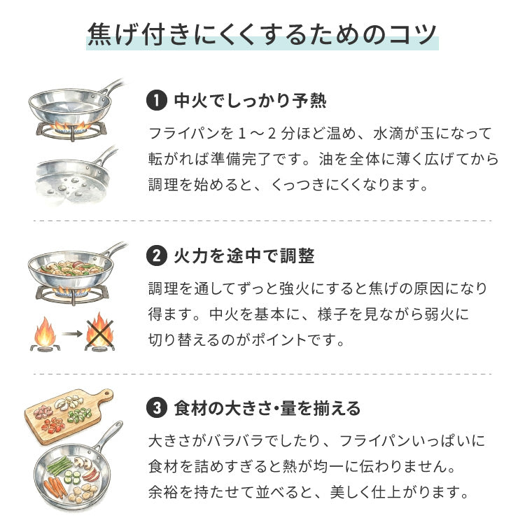■フッ素樹脂を一切使わない、ステンレス製の本格派フライパンです。