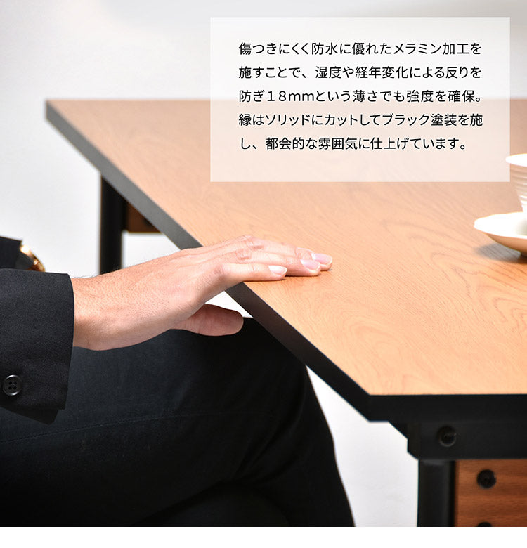固く反りに強いパーティクルボード(木質繊維板)にメラミン化粧板を貼って仕上げた天板は傷つきにくく防水に優れています。