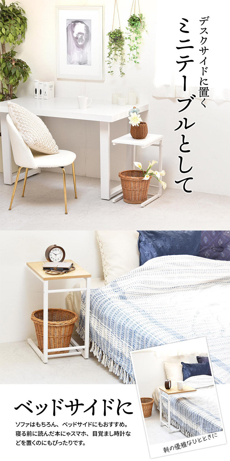 シンプルなコの字のデザインに、機能性と耐久性を持ち合わせたサイドテーブル。ベッド脇のサイドテーブルとして使ったり、ソファ周りのコーヒーテーブルとして使ったりするのにおすすめです。また、底面部分をソファやベッドの隙間に差し込めるため、グッと体に近づけられます。脚には補強の三角板、丸パイプを3本使い耐久性をアップ。実用性と耐久性を兼ね備えたサイドテーブルです。