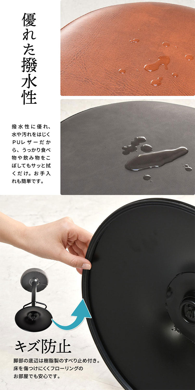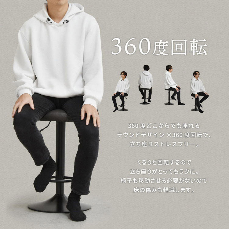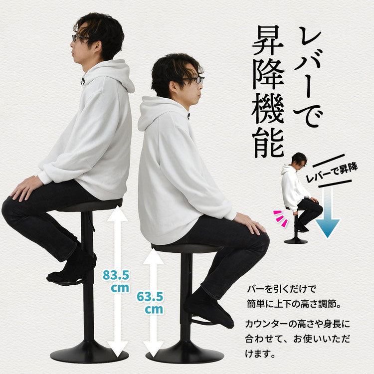 シンプルな丸型の座面が特徴のカウンターチェア、バーチェア。ボリューム感ある厚手の座面で、座り心地も◎。テーブルの高さや座る人の身長に合わせて、レバー1つで63.5~83.5cmの間で座面の高さを調節できます。座面が360度回転するので、どこからでも立ち座りでき、椅子を引くぶんのスペースが必要ないのが強みで、脚元には足置きもついているので、シンプルながら使いやすいデザインとなっています。カウンターチェアを置けるスペースが限られているなら、1本脚の回転式がおすすめです。シックな色味の2カラーで、上品で洗練された大人の空間作りにマッチ。カウンターテーブルとコントラストをそろえることで、より落ち着いた雰囲気づくりができます。