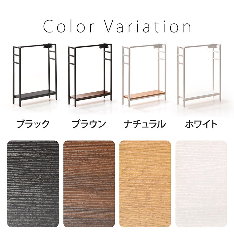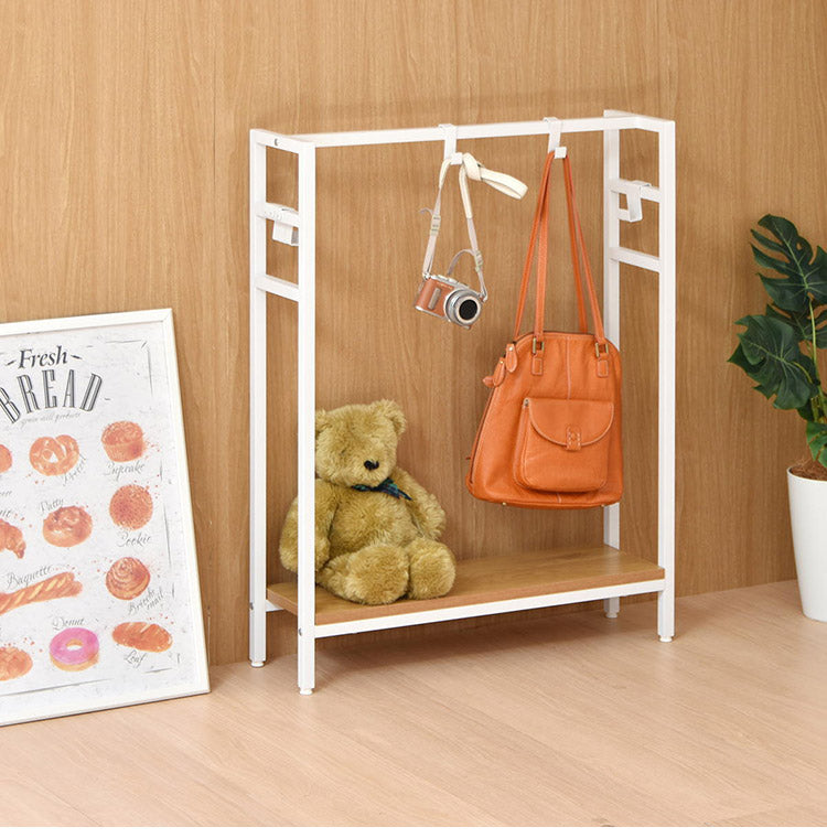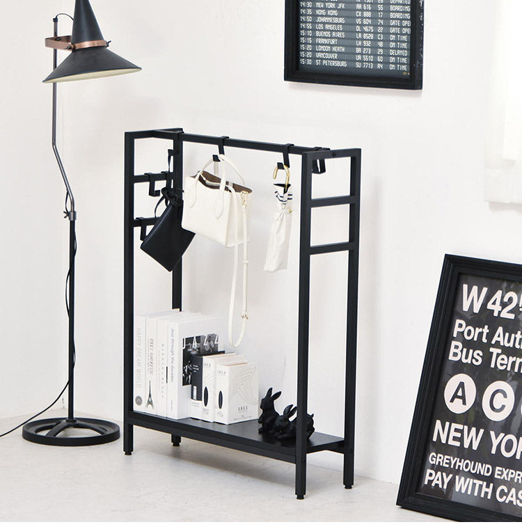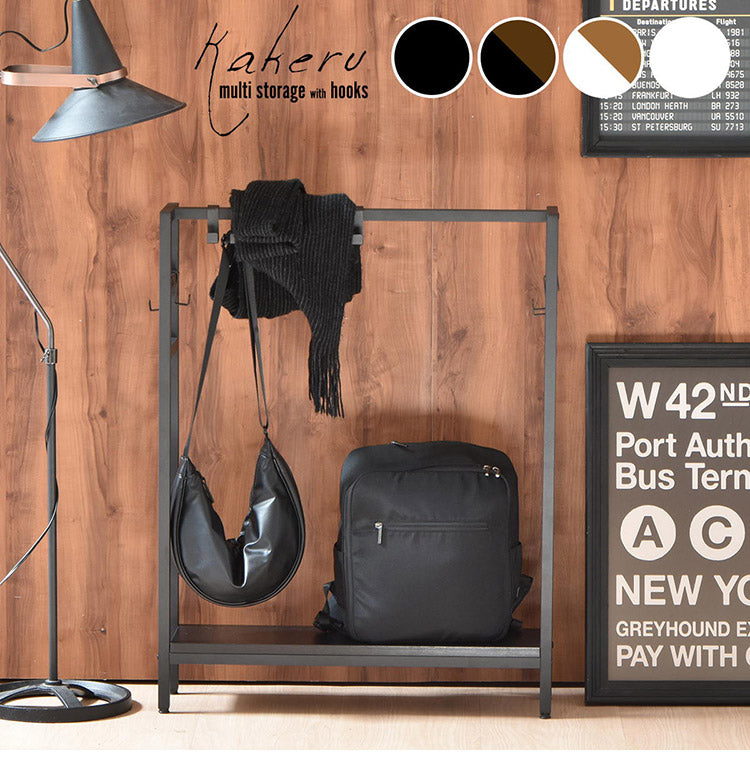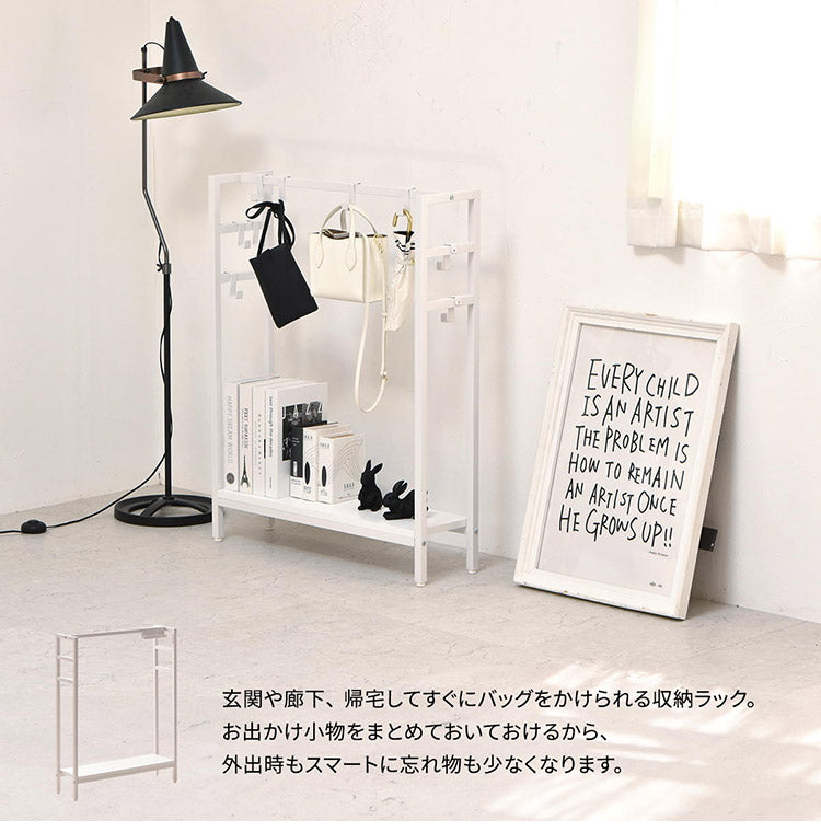 玄関、リビングにも置きやすい、スリムなフック付きマルチ収納ラック。フレームはマットな質感のスチールで、下部の棚板がアクセントになっています。