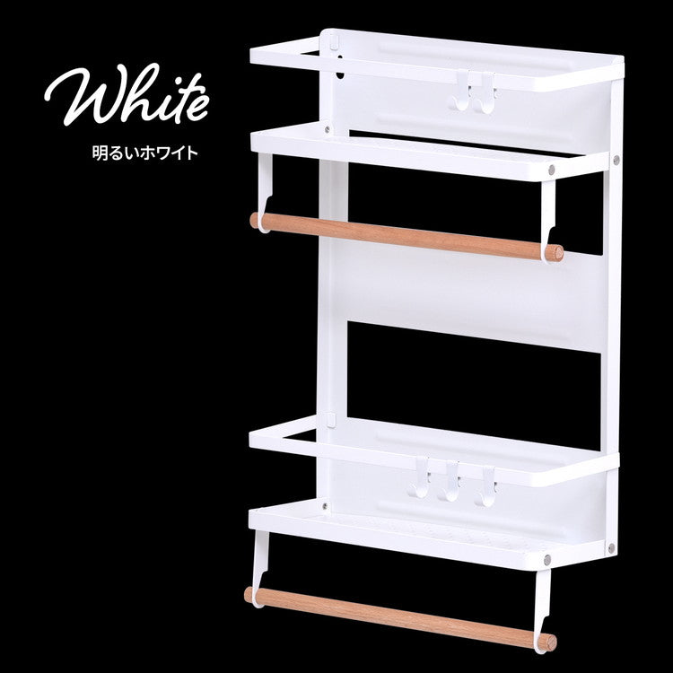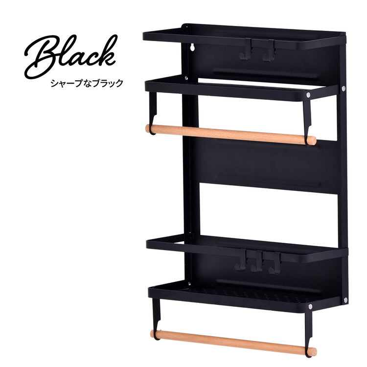 スタイリッシュなホワイト、ブラックを基調とした収納シリーズMarche(マルシェ)。おうちの中の小物を見栄え良く整理するのに便利なシリーズです。上段・下段の棚は調味料ケースやスパイス類などを置くのにぴったりです。2本のハンガーにはキッチンペーパーホルダー、タオルや布巾、スプレーボトル、トングなど引っ掛けて使えます。