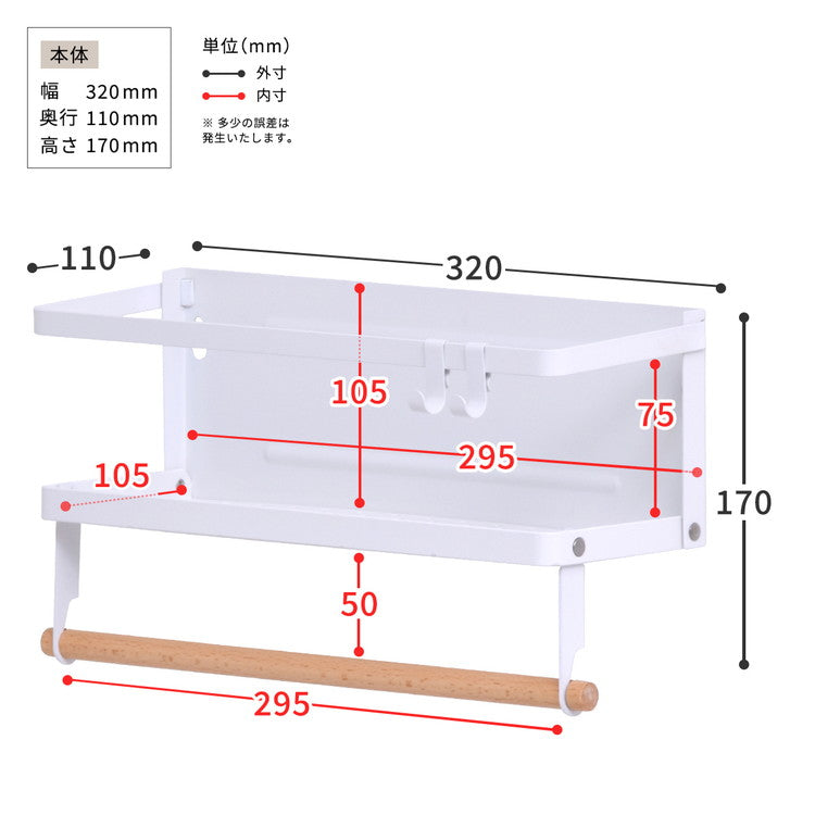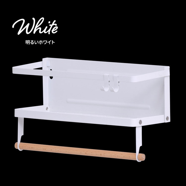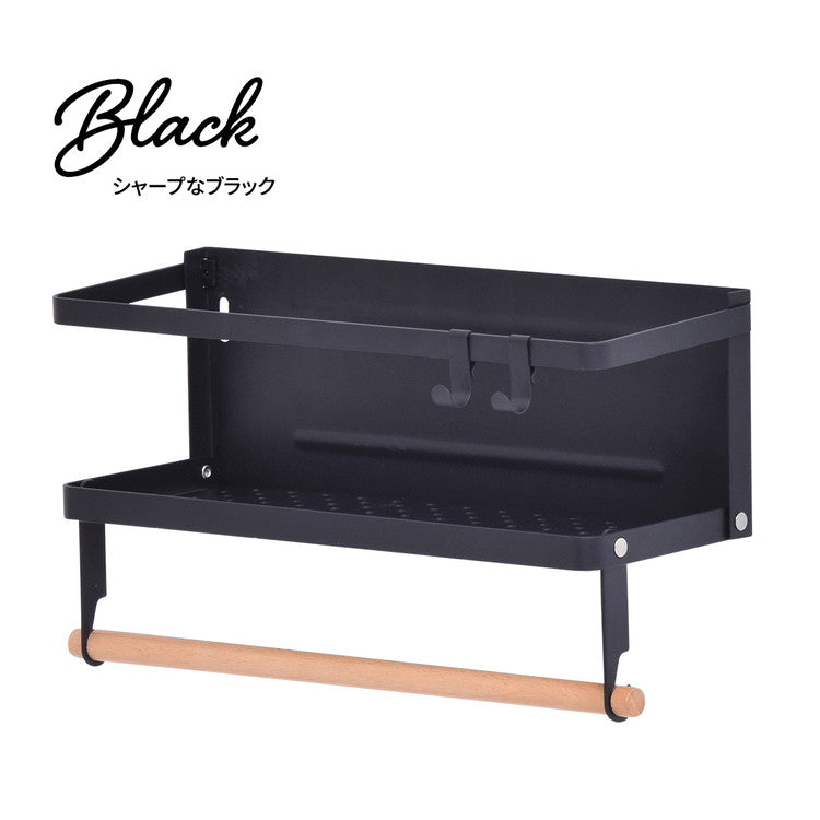 スタイリッシュなホワイト、ブラックを基調とした収納シリーズMarche(マルシェ)。おうちの中の小物を見栄え良く整理するのに便利なシリーズです。上段の棚は調味料ケースやスパイス類などを置くのにぴったりです。ハンガーにはキッチンペーパーホルダー、タオルや布巾、スプレーボトル、トングなど引っ掛けて使えます。