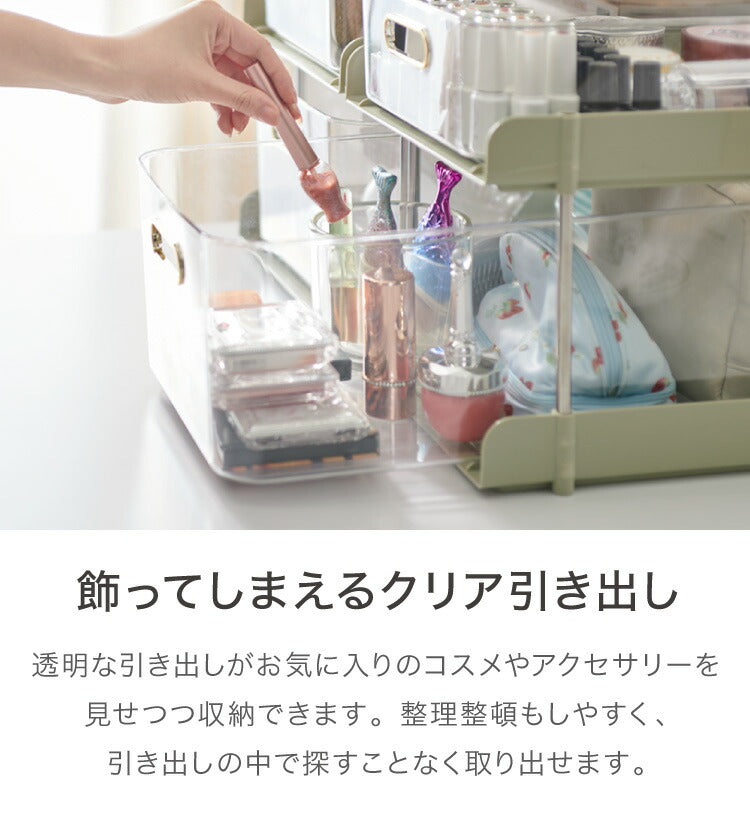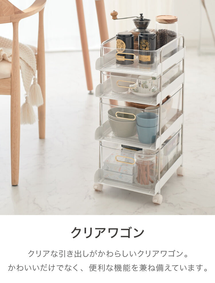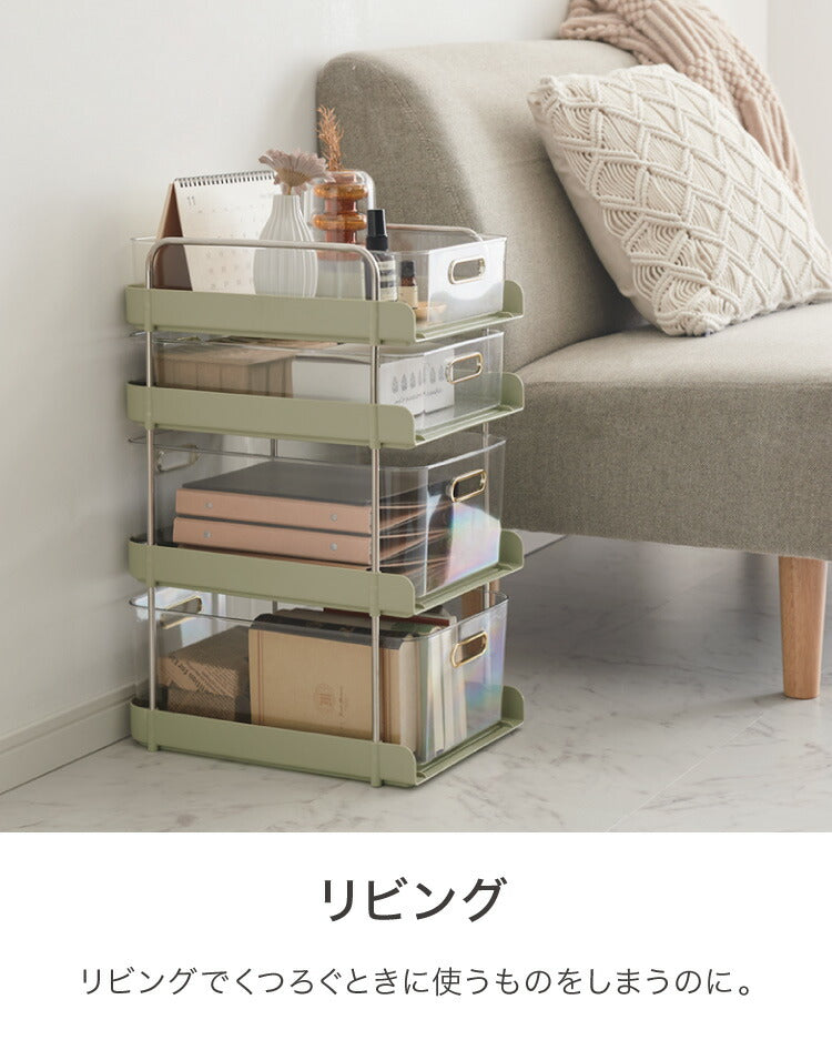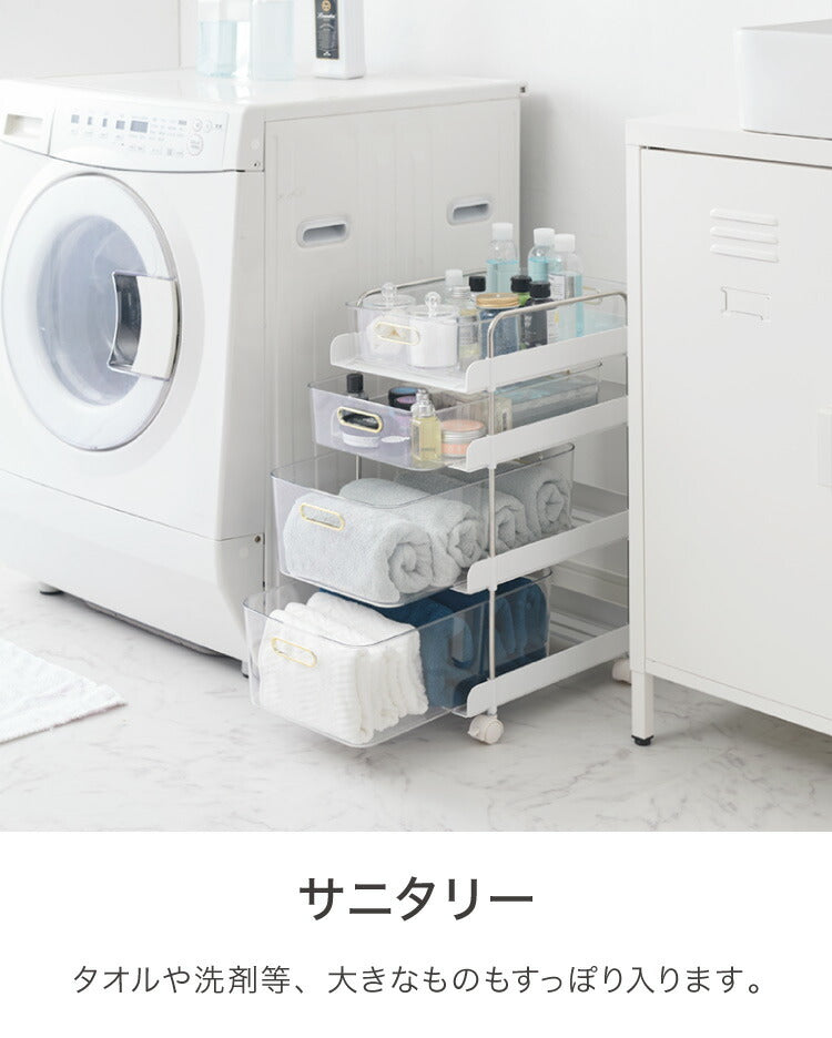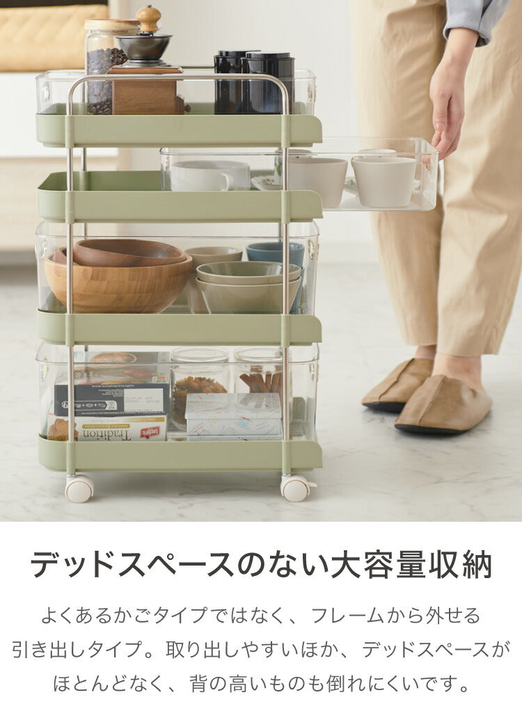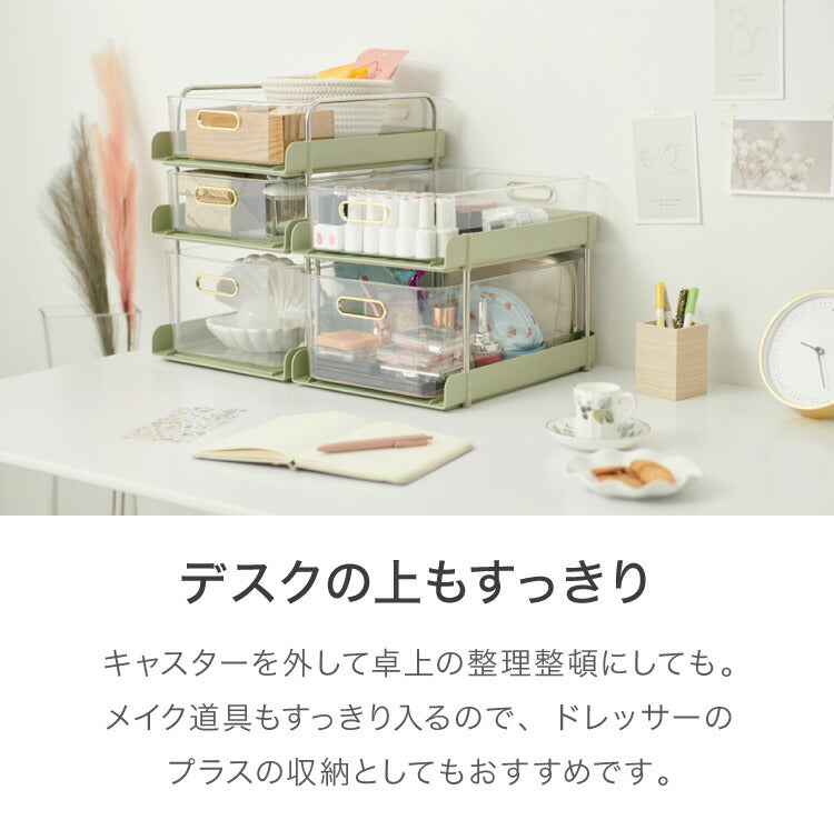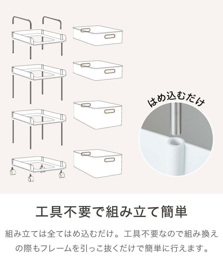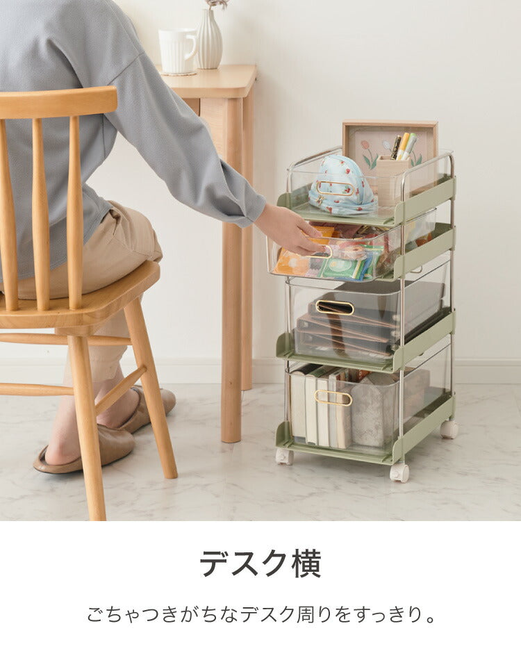 工具が必要なく挿し込むだけで組立が完成するフェミニワゴン。引出が透明なのでどこに何が入っているかわかりやすくて便利。棚部分のくすみカラーと、ゴールド取手の組み合わせが、フェミニンでかわいらしいデザインに仕上がっています。