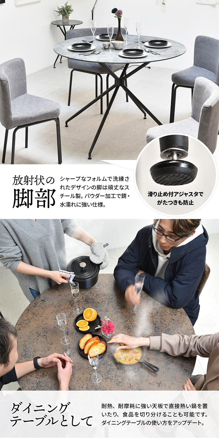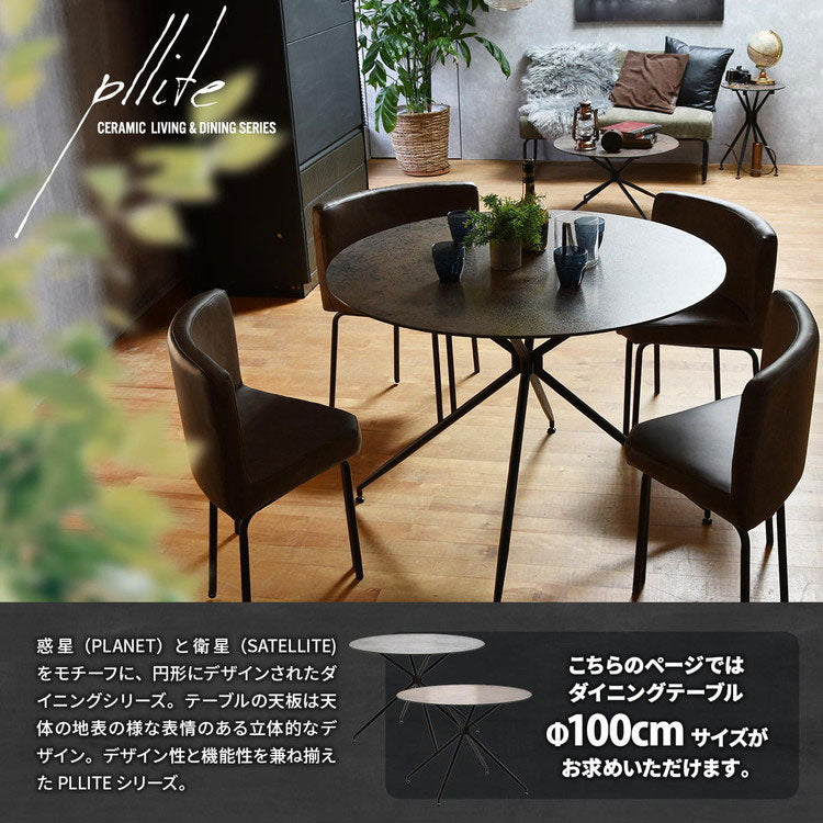 天体の中の惑星(PLANET)と衛星(SATELLITE)をモチーフにして、円形にデザインされたPLLITEシリーズのダイニングテーブル幅100です。天板には強化ガラスの表面にセラミックが焼き付けられており、「耐火・耐熱性」「防水性」「表面硬度」などに非常に優れています。ムーン柄は月をモチーフに、マーズ柄は火星をモチーフにしてデザインされており、月のクレータの様な表情になるように、表面には少し凹凸のある仕上げにする事で、立体的なデザインになり洗礼されたおしゃれな仕上がりになっています。天板のデザインが引き立つように脚のデザインにも工夫を凝らし、放射線状に伸びるような構造の脚にする事で全体的なバランスを整えました。デザイン性と機能性を兼ね揃えたPLLITEシリーズはおすすめです。
