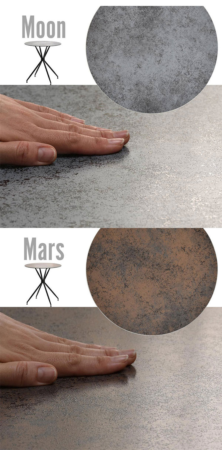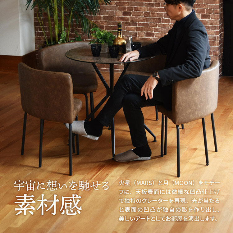天体の中の惑星(PLANET)と衛星(SATELLITE)をモチーフにして、円形にデザインされたPLLITEシリーズのダイニングテーブル幅70とチェア4脚の「5点セット」です。天板には強化ガラスの表面にセラミックが焼き付けられており、「耐火・耐熱性」「防水性」「表面硬度」などに非常に優れています。ムーン柄は月をモチーフに、マーズ柄は火星をモチーフにしてデザインされており、月のクレータの様な表情になるように、表面には少し凹凸のある仕上げにする事で、立体的なデザインになり洗礼されたおしゃれな仕上がりになっています。天板のデザインが引き立つように脚のデザインにも工夫を凝らし、放射線状に伸びるような構造の脚にする事で全体的なバランスを整えました。チェアは個性的なデザインの天板に合うように、選び抜かれた生地が使用されているので、同シリーズでまとめるとお部屋の空間にも統一感が出ておすすめです。