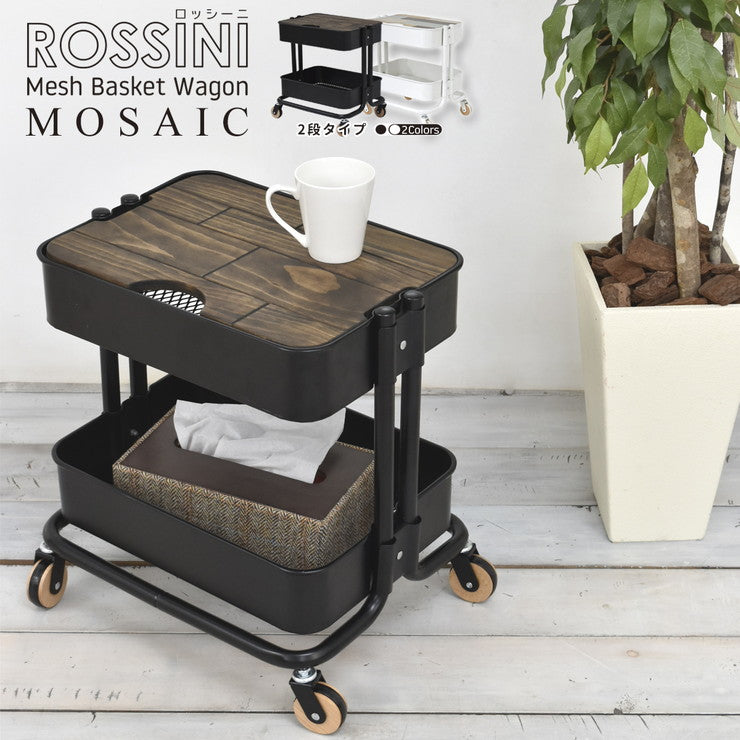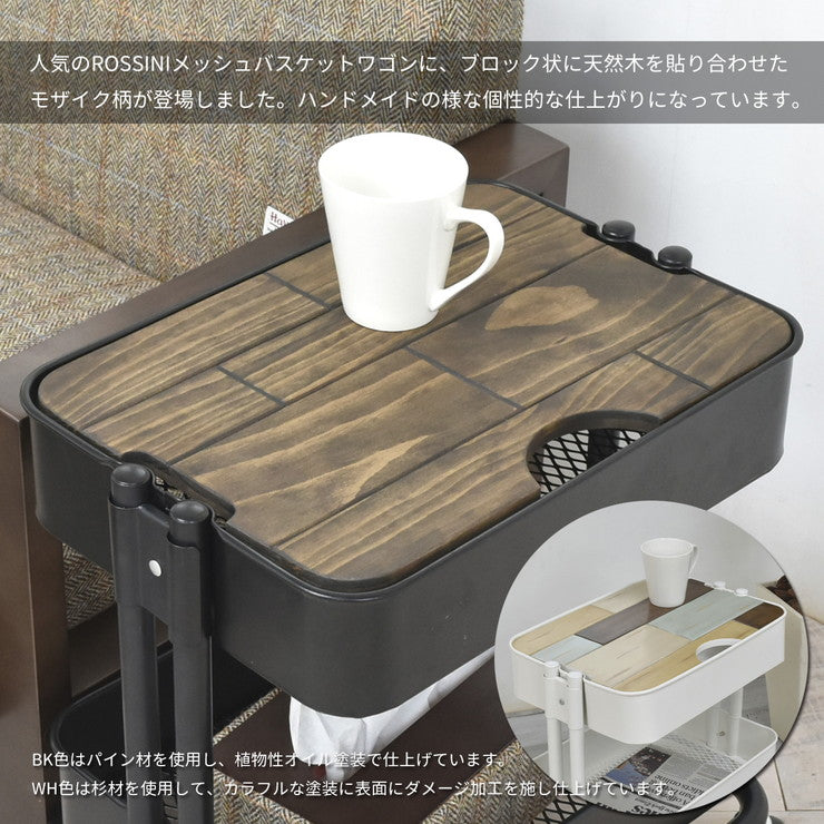 人気のROSSINIメッシュバスケットワゴンに、ブロック状に天然木を貼り合わせたモザイク柄が登場しました。ハンドメイドの様な個性的な仕上がりになっています。