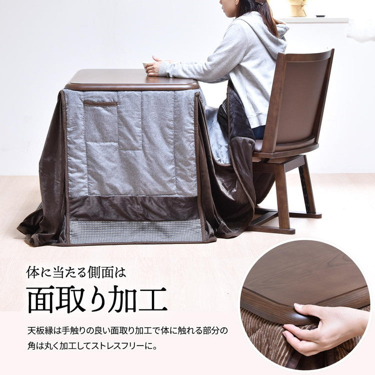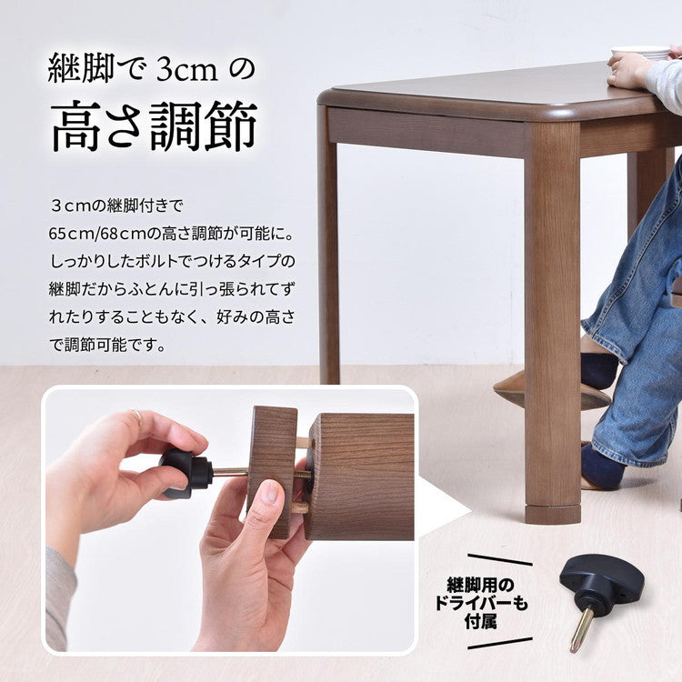 シンプルで落ち着きのある「栓(セン)」柄シートを使用し、シンプルで飽きの来ないデザインのハイコタツ兼ダイニングテーブルです。天板の角はアールを施して丸みのあるデザインになっているので、触り心地もいいです。どこか懐かしく落ち着いた木目と、色は「ブラウン」と「ナチュラル」の2色展開で、両方ともシンプルで落ち着いた色なので、お部屋にマッチしやすいです。高さは65cmと68cmの2段階調整ができ、お好みの高さでご使用いただけます。ヒーター部分は安心な日本メーカーのメトロ電気工業の製品が使用されており、手元で温度調節ができるコントローラー付いていて便利です。ハイタイプのコタツなので、布団を外せばコタツを使わない季節でも普通のダイニングテーブルとしても使えるので、一年通して使えるコタツ兼ダイニングテーブルとして人気です。天板塗装には耐久性の高いUV塗装を施しているので、高品質なので長くお使い頂けます。こたつはエアコンと比較すると、約3分1の電気代で済むと言われており昨今の高騰する電気代の節約にも優れています。