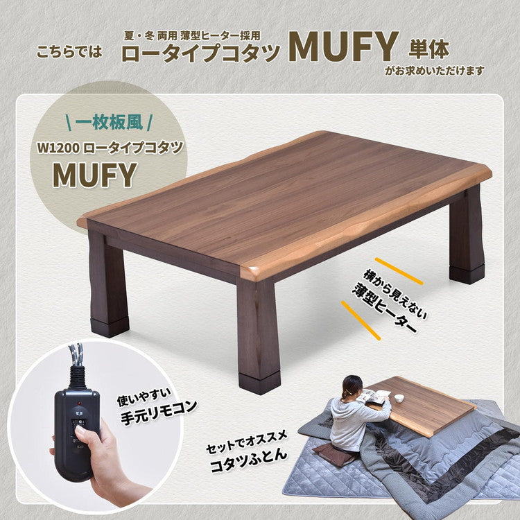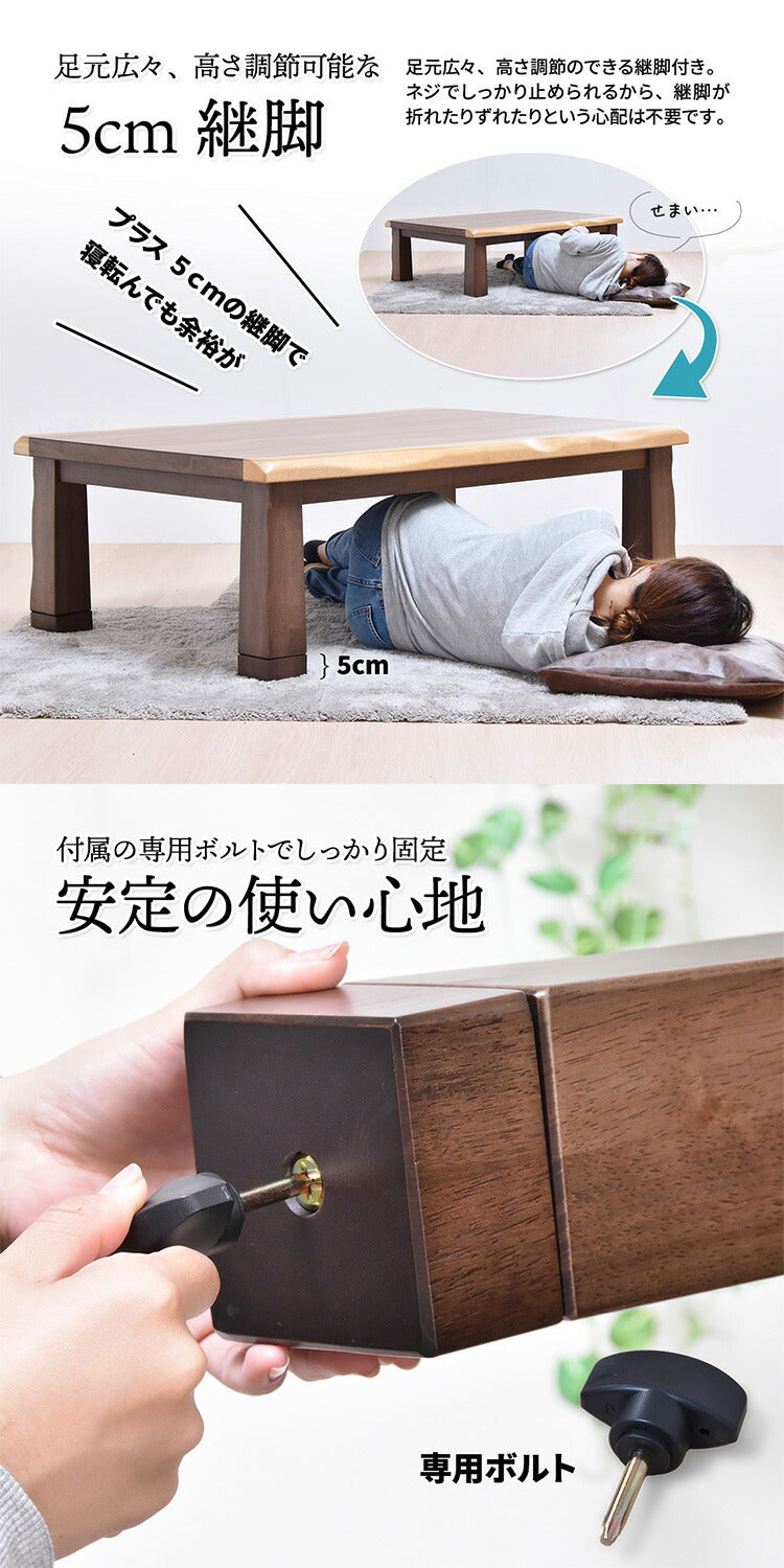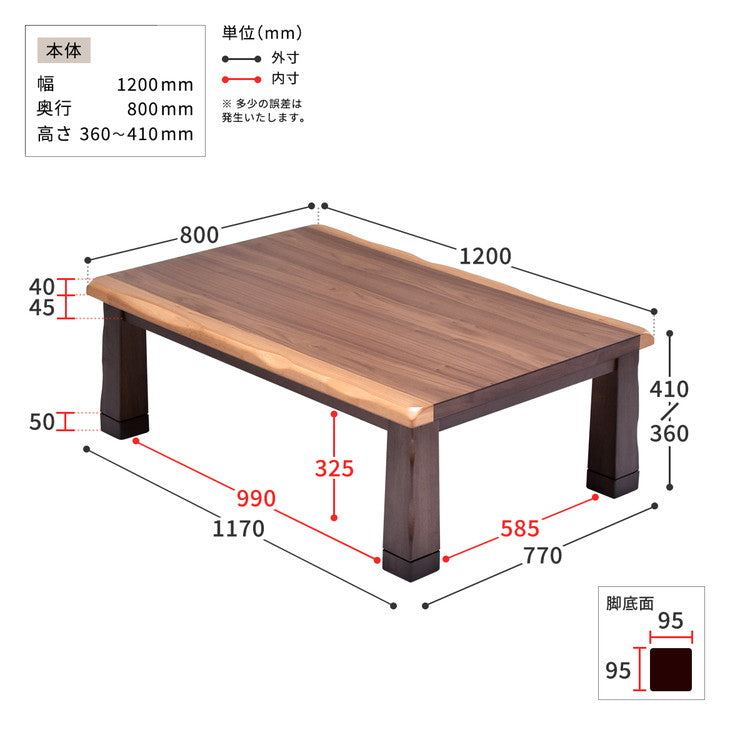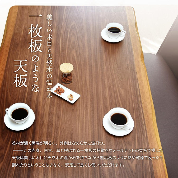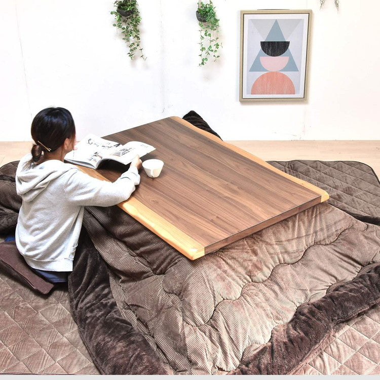 無垢の一枚板天然木風にアレンジされた、重厚感のある天板が魅力のコタツ兼ローテーブルです。天板の端は一枚板ならではの耳といわれる凸凹した部分もうまく表現されており、本物の一枚板のような風合いが感じられます。日本でも人気の高い世界三大銘木【ウォールナット】突板を使用しており、おしゃれで落ち着いた木目なので、色んなお部屋にマッチします。高さは36cmと41cmの2段階調整ができ、お好みの高さでご使用いただけます。ヒーター部分は安心な日本メーカーのメトロ電気工業の製品が使用されており、手元で温度調節ができるコントローラー付いていて便利です。布団を外せば普通のローテーブルとしても使えるので、一年通して使えるコタツ兼ローテーブルとして人気です。天板塗装には耐久性の高いUV塗装を施しているので、高品質なので長くお使い頂けます。こたつはエアコンと比較すると、約3分1の電気代で済むと言われており昨今の高騰する電気代の節約にも優れています。
