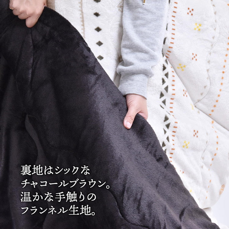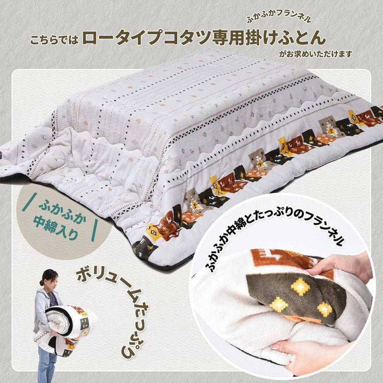 ローコタツ専用の掛布団です。適度な厚みの掛布団なので、薄すぎて寒いという事もなく、厚すぎてごわつくという事もなく、使いやすいのではないかと思います。白を基調にした生地の裾部分には、色んな柄描かれているので、それがアクセントになり、少しこだわりたい方にちょうど良い感じの雰囲気になっています。対応サイズは【幅105~120×奥行75~80cmのロータイプコタツ】に対応した掛布団になります。