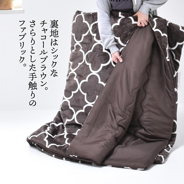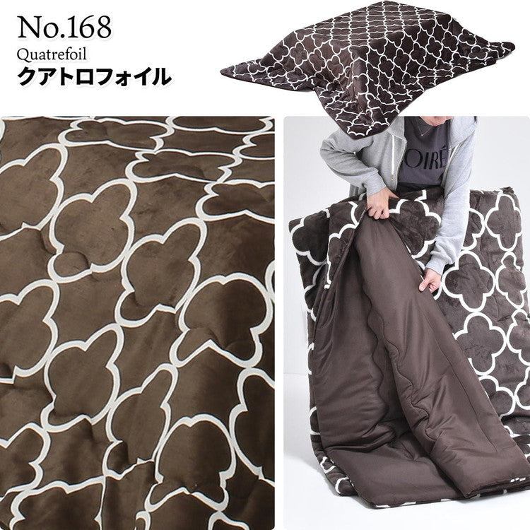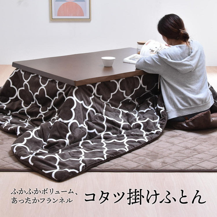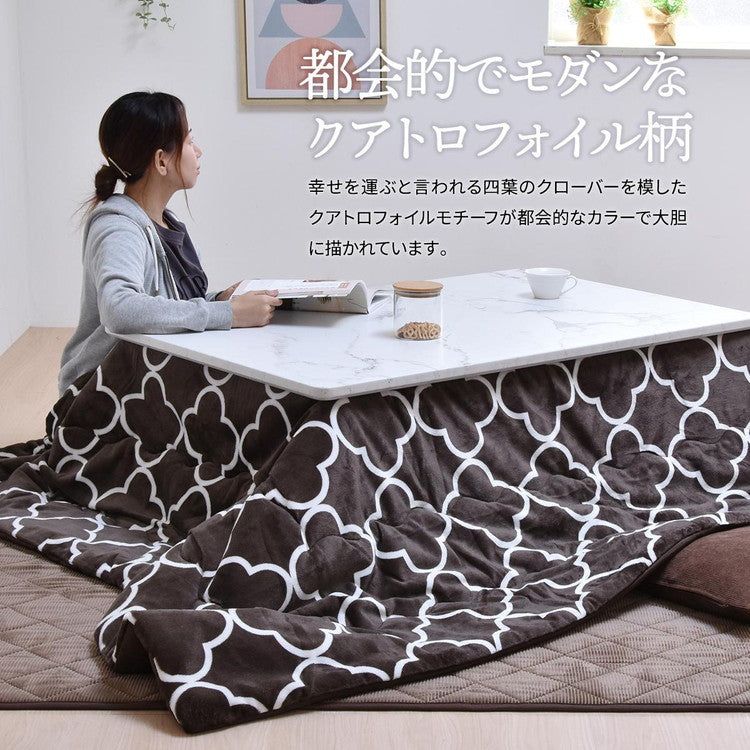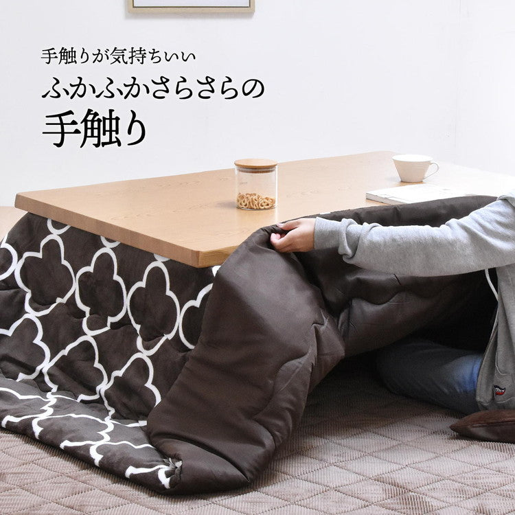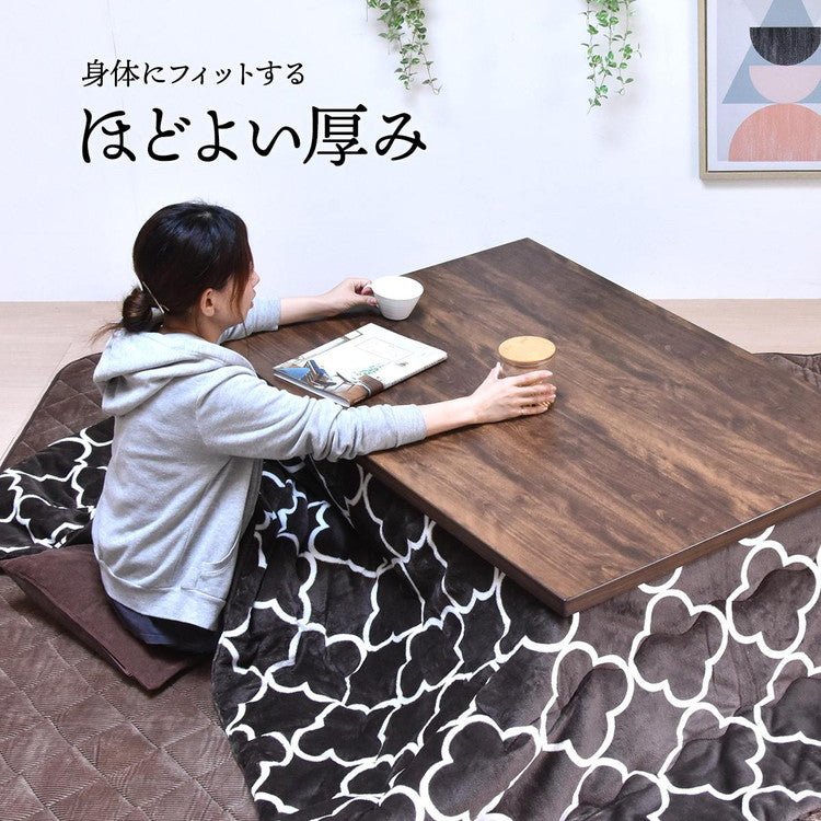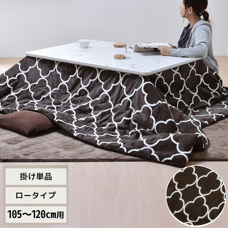 ローコタツ専用の掛布団です。適度な厚みの掛布団なので、薄すぎて寒いという事もなく、厚すぎてごわつくという事もなく、使いやすいのではないかと思います。黒を基調にした生地に、四葉のような柄があしらわれており、シックで落ち着いた柄でありながら少し個性のある仕上がりです。対応サイズは【幅105~120×奥行75~80cmのロータイプコタツ】に対応した掛布団になります。