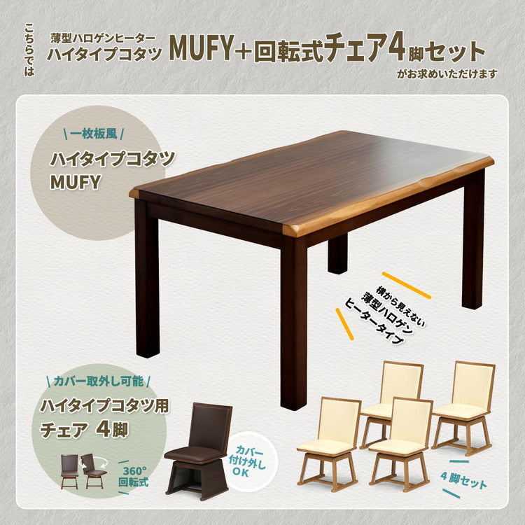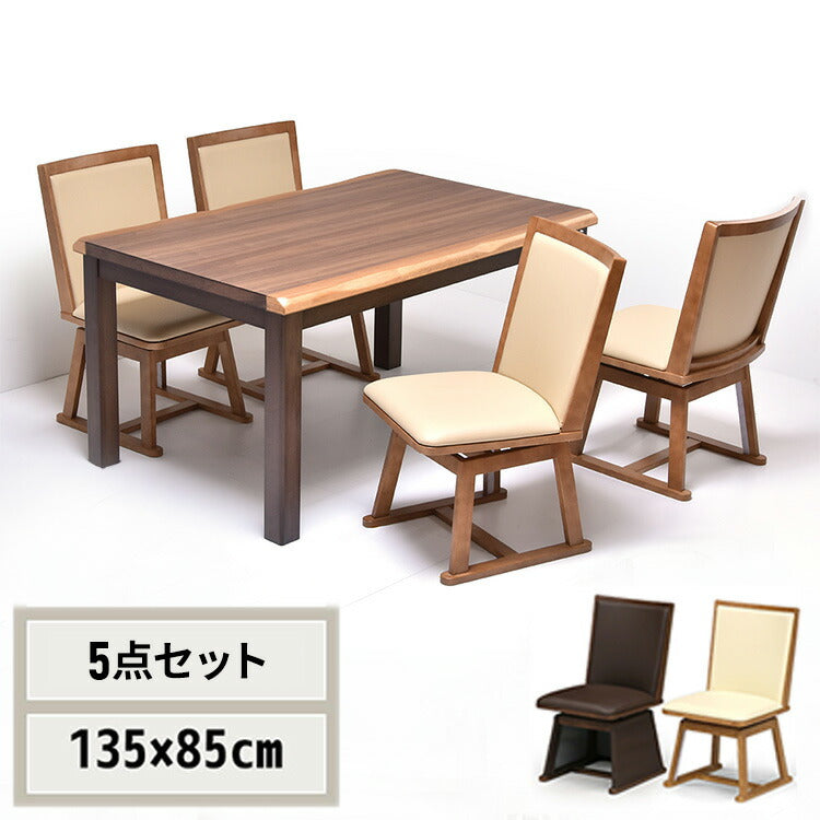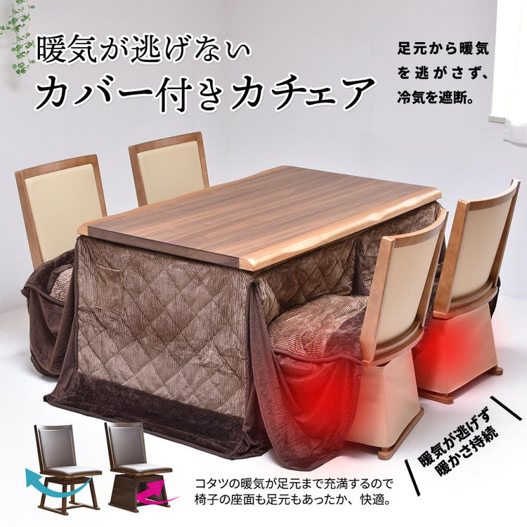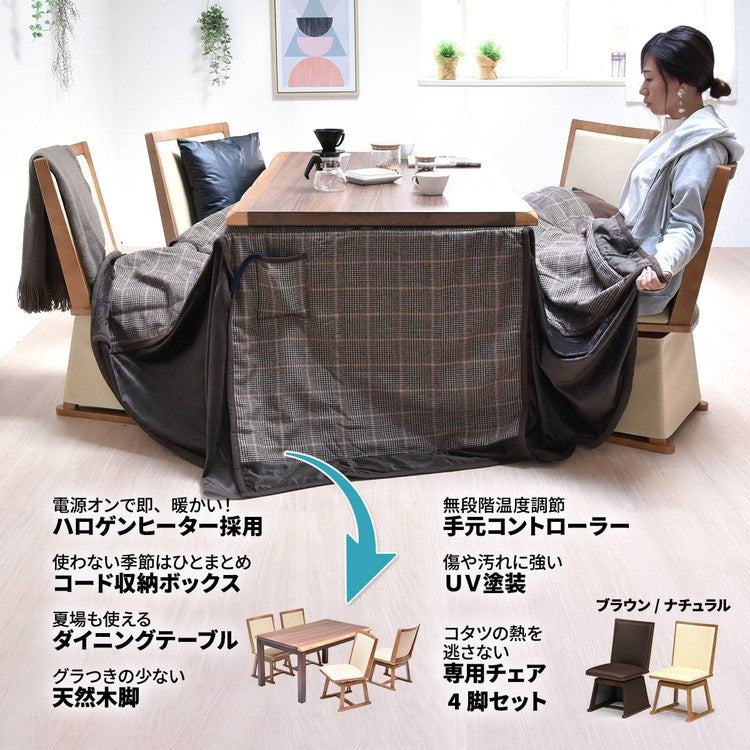 無垢の一枚板天然木風にアレンジされた、重厚感のある天板が魅力のハイコタツ兼ダイニングテーブルと、回転式チェアーが4脚の合計【5点セット】です。天板の端は一枚板ならではの耳といわれる凸凹した部分もうまく表現されており、本物の一枚板のような風合いが感じられます。ヒーター部分は安心な日本メーカーのメトロ電気工業の製品が使用されており、手元で温度調節ができるコントローラー付いていて便利です。チェアーは立ったり座ったりするのに便利な回転式で、ブラウンとナチュラルの2色から選べます。冬場はコタツで、それ以外の季節は通常のダイニングテーブルとして、1年通してご使用いただけます。こたつはエアコンと比較すると、約3分1の電気代で済むと言われており昨今の高騰する電気代の節約にも優れています。