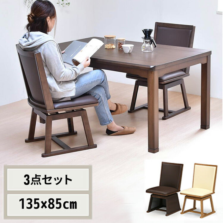 タモの突板をふんだんに使用し、落ち着いた見た目のハイコタツ兼ダイニングテーブルと、回転式チェアーが2脚の合計【3点セット】です。天板の端を少しアールをつけた加工を施す事で少し丸みのあるデザインなので、直線的な工業品とは一線画した自然な風合いがあります。コタツは高さ65cmと68cmの2段階調整ができ、お好みの高さでご使用いただけます。ヒーター部分は安心な日本メーカーのメトロ電気工業の製品が使用されており、手元で温度調節ができるコントローラー付いていて便利です。チェアーは立ったり座ったりするのに便利な回転式です。コタツとチェアーは「ブラウン」と「ナチュラル」の2色展開で、両方ともシンプルで落ち着いた色なので、お部屋にマッチしやすいです。こたつはエアコンと比較すると、約3分1の電気代で済むと言われており昨今の高騰する電気代の節約にも優れています。