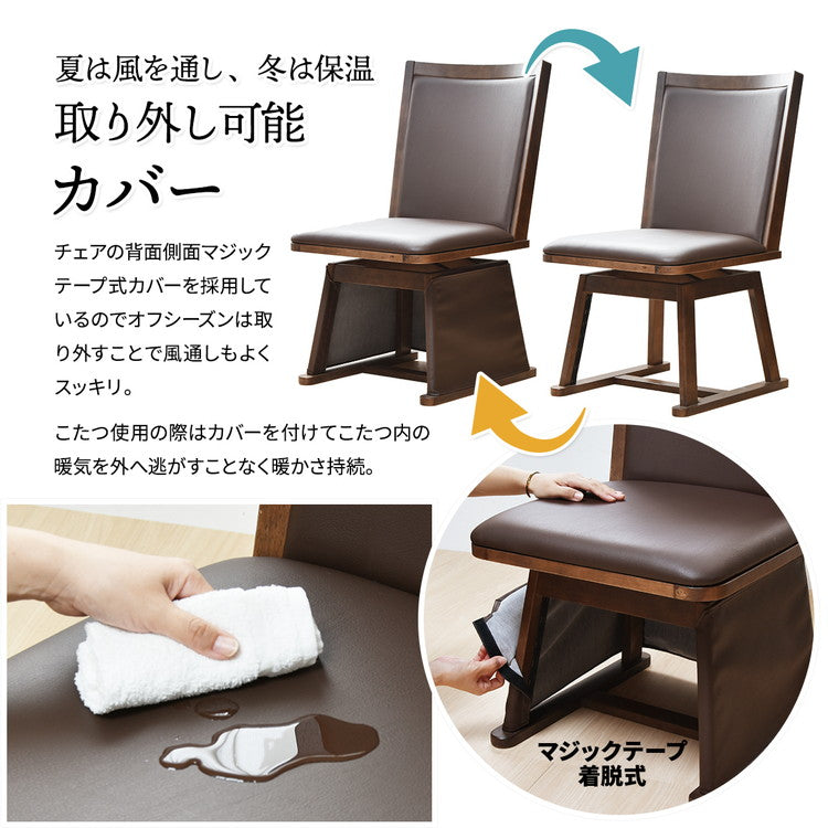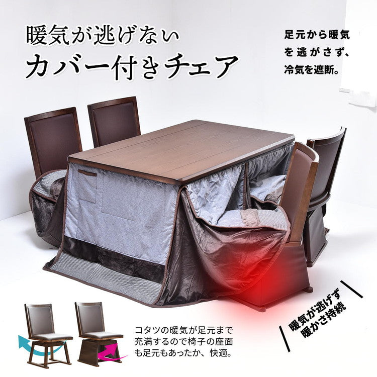 人気の高いウォールナット柄シートを使用し、シンプルで飽きの来ないデザインのハイコタツ兼ダイニングテーブルと、回転式チェアーが2脚の合計【3点セット】です。日本でも人気の高い世界三大銘木【ウォールナット】柄シートを使用しており、おしゃれで落ち着いた木目なので、色んなお部屋にマッチします。ヒーター部分は安心な日本メーカーのメトロ電気工業の製品が使用されており、手元で温度調節ができるコントローラー付いていて便利です。ハイタイプのコタツなので、布団を外せばコタツを使わない季節でも普通のダイニングテーブルとしても使えるので、一年通して使えるコタツ兼ダイニングテーブルとして人気です。天板塗装には耐久性の高いUV塗装を施しているので、高品質なので長くお使い頂けます。チェアーは立ったり座ったりするのに便利な回転式です。チェアーはブラウンとナチュラルの2色から選べます。こたつはエアコンと比較すると、約3分1の電気代で済むと言われており昨今の高騰する電気代の節約にも優れています。