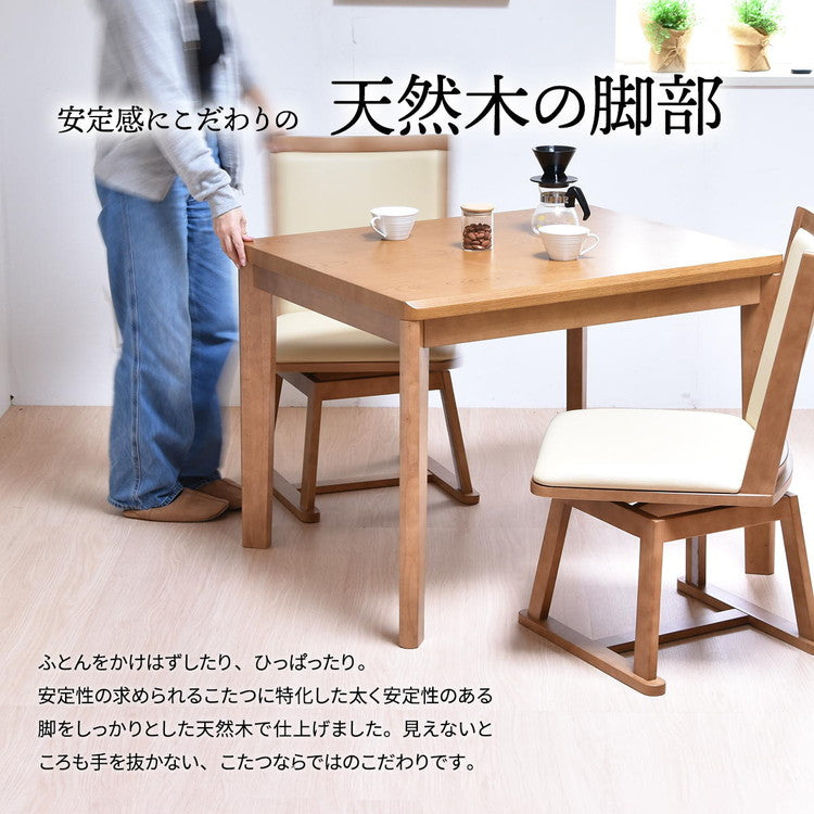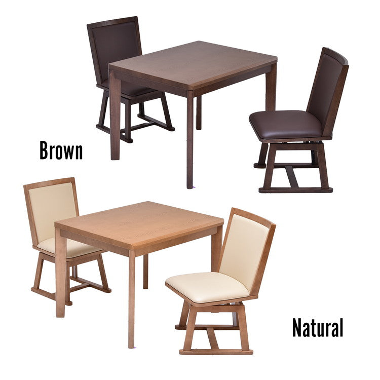 シンプルで落ち着きのある「栓(セン)」柄シートを使用し、シンプルで飽きの来ないデザインのハイコタツ兼ダイニングテーブルと、回転式チェアーが2脚の合計【3点セット】です。どこか懐かしく落ち着いた木目はお部屋にマッチしやすいです。ヒーター部分は安心な日本メーカーのメトロ電気工業の製品が使用されており、手元で温度調節ができるコントローラー付いていて便利です。ハイタイプのコタツなので、布団を外せばコタツを使わない季節でも普通のダイニングテーブルとしても使えるので、一年通して使えるコタツ兼ダイニングテーブルとして人気です。コタツの天板塗装には耐久性の高いUV塗装を施しているので、高品質なので長くお使い頂けます。チェアーは立ったり座ったりするのに便利な回転式です。コタツとチェアーはブラウンとナチュラルの2色から選べます。こたつはエアコンと比較すると、約3分1の電気代で済むと言われており昨今の高騰する電気代の節約にも優れています。