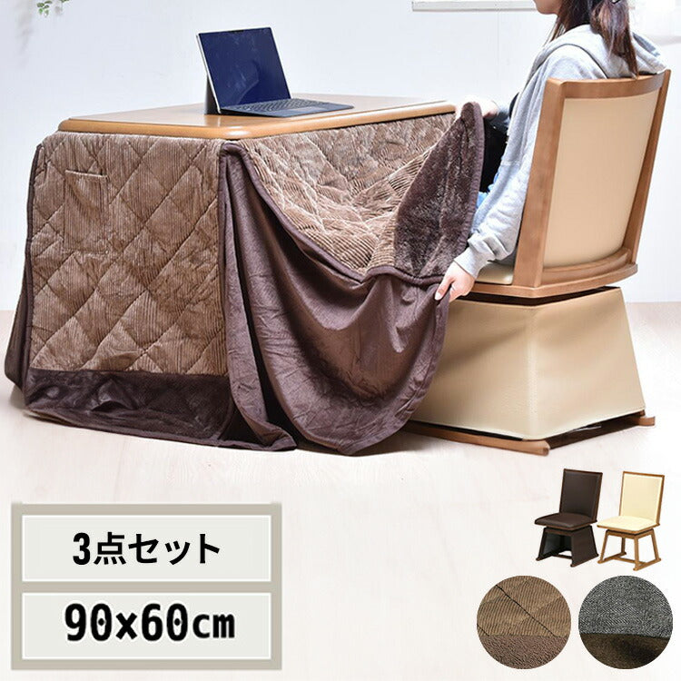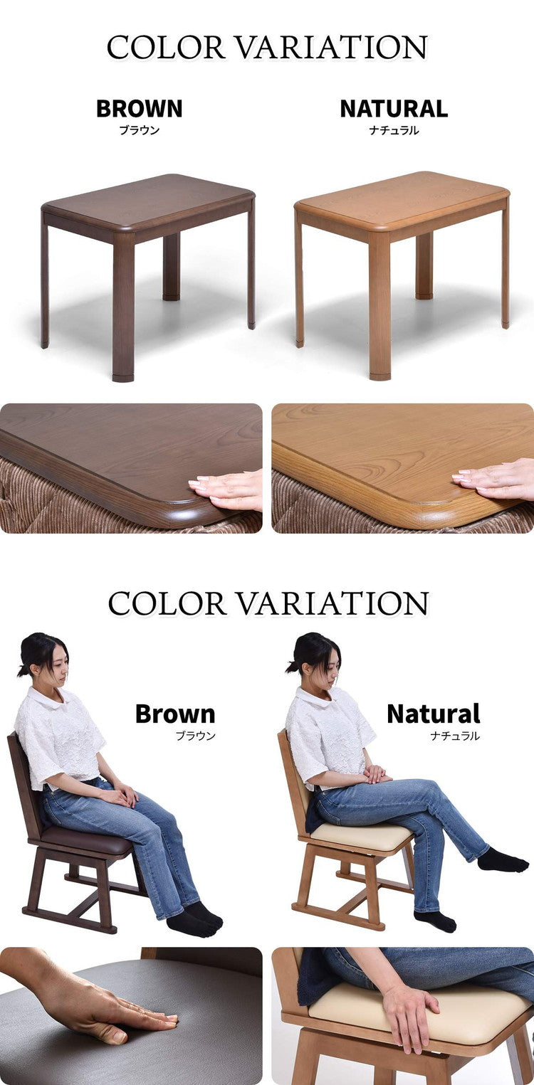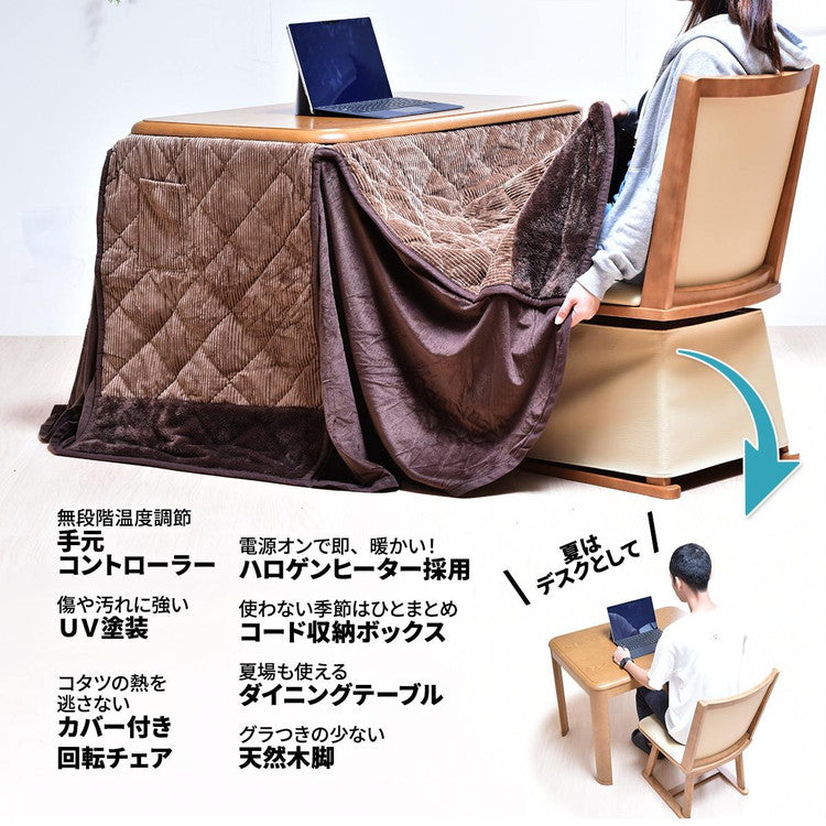 シンプルで落ち着きのある「栓(セン)」柄シートを使用し、シンプルで飽きの来ないデザインのハイコタツ兼ダイニングテーブルと、回転式チェアーが1脚と、掛布団の合計【3点セット】です。天板の角はアールを施して丸みのあるデザインになっているので、触り心地もいいです。どこか懐かしく落ち着いた木目と、色は「ブラウン」と「ナチュラル」の2色展開で、両方ともシンプルで落ち着いた色なので、お部屋にマッチしやすいです。高さは65cmと68cmの2段階調整ができ、お好みの高さでご使用いただけます。ヒーター部分は安心な日本メーカーのメトロ電気工業の製品が使用されており、手元で温度調節ができるコントローラー付いていて便利です。ハイタイプのコタツなので、布団を外せばコタツを使わない季節でも普通のダイニングテーブルとしても使えるので、一年通して使えるコタツ兼ダイニングテーブルとして人気です。天板塗装には耐久性の高いUV塗装を施しているので、高品質なので長くお使い頂けます。チェアーは立ったり座ったりするのに便利な回転式です。コタツとチェアーはブラウンとナチュラルの2色から選べて、掛布団も2種類の中か選べて選択肢もたくさんあるので、お好みの組み合わせが見つかります。こたつはエアコンと比較すると、約3分1の電気代で済むと言われており昨今の高騰する電気代の節約にも優れています。