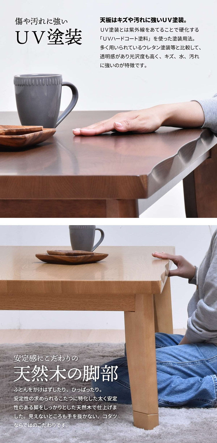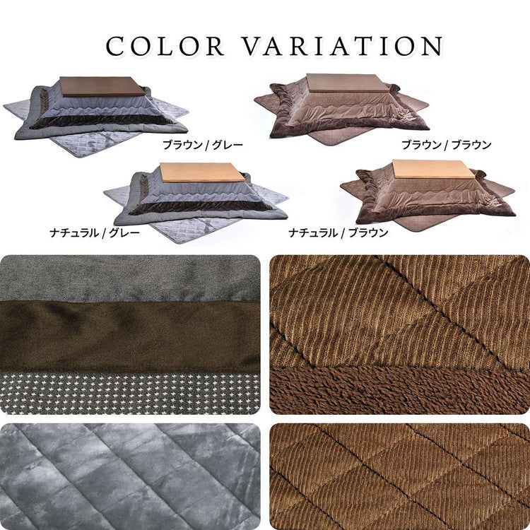 シンプルで落ち着きのある「栓(セン)」柄シートを使用し、シンプルで飽きの来ないデザインのコタツ兼ローテーブルと、掛布団、敷布団の合計【3点セット】です。天板の端には、一枚板の耳といわれる凸凹した部分もうまく表現されており、本物の一枚板のような風合いが感じられます。どこか懐かしく落ち着いた木目と、色は「ブラウン」と「ナチュラル」の2色展開で、両方ともシンプルで落ち着いた色なので、お部屋にマッチしやすいです。高さは36cmと41cmの2段階調整ができ、お好みの高さでご使用いただけます。ヒーター部分は安心な日本メーカーのメトロ電気工業の製品が使用されており、手元で温度調節ができるコントローラー付いていて便利です。布団を外せばコタツを使わない季節でも普通のローテーブルとしても使えるので、一年通して使えるコタツ兼ローテーブルとして人気です。天板塗装には耐久性の高いUV塗装を施しているので、高品質なので長くお使い頂けます。掛・敷布団は、グレーとブラウンを基調とした生地で落ち着きがあり、掛布団は中綿がしっかり詰まってボリュームのある布団なので暖かく高級感があります。こたつはエアコンと比較すると、約3分1の電気代で済むと言われており昨今の高騰する電気代の節約にも優れています。
