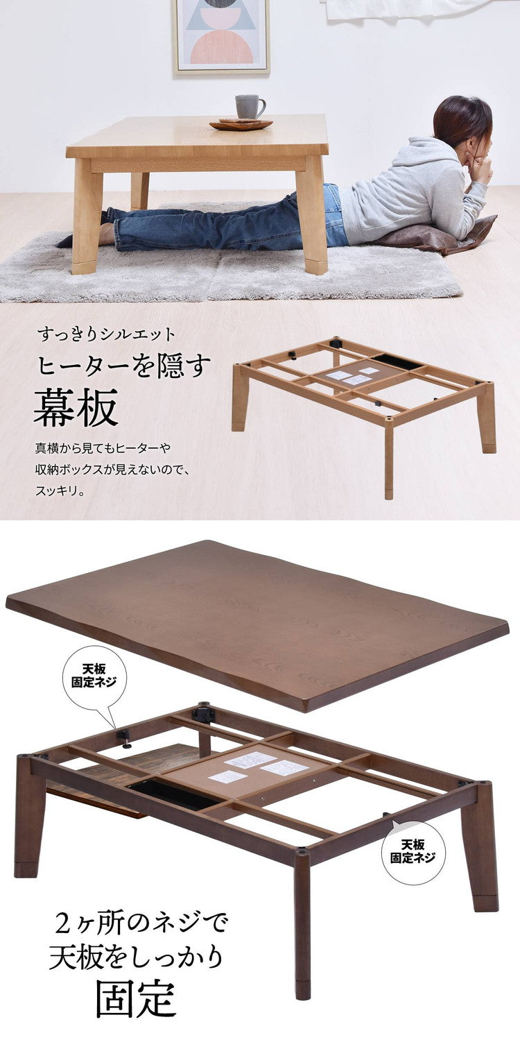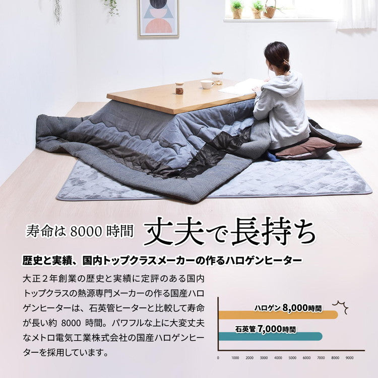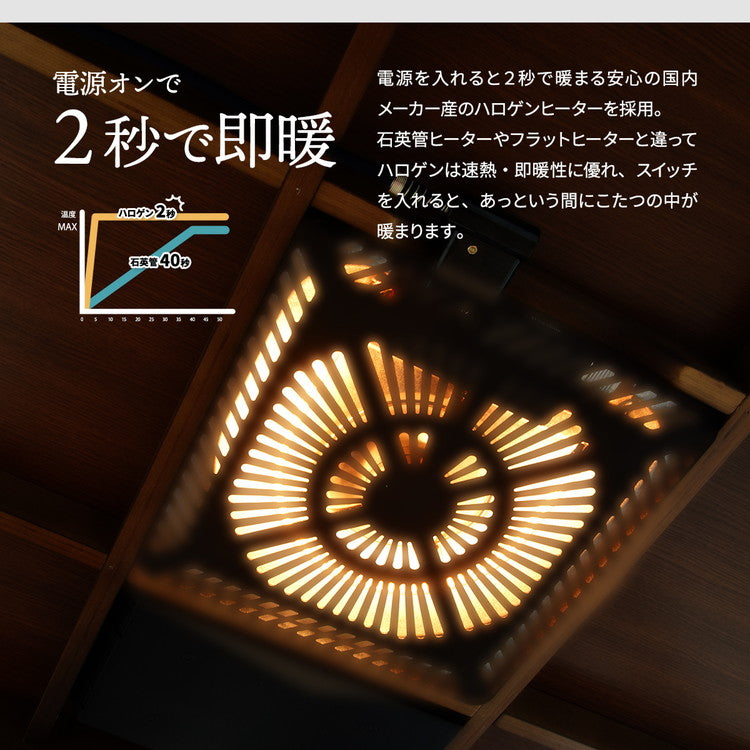 素材:【天板】プリント化粧合板(UV塗装) 【脚フレーム】天然木(ウレタン塗装)【ヒーター】U字型ハロゲンヒーター「メーカー型番:MHU-601E(D)」 /